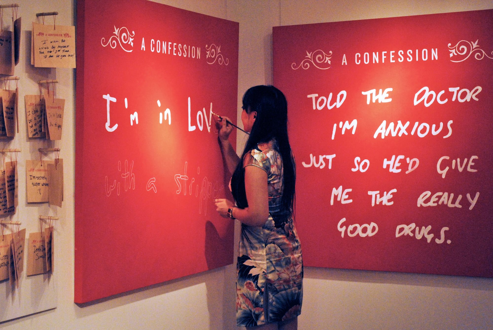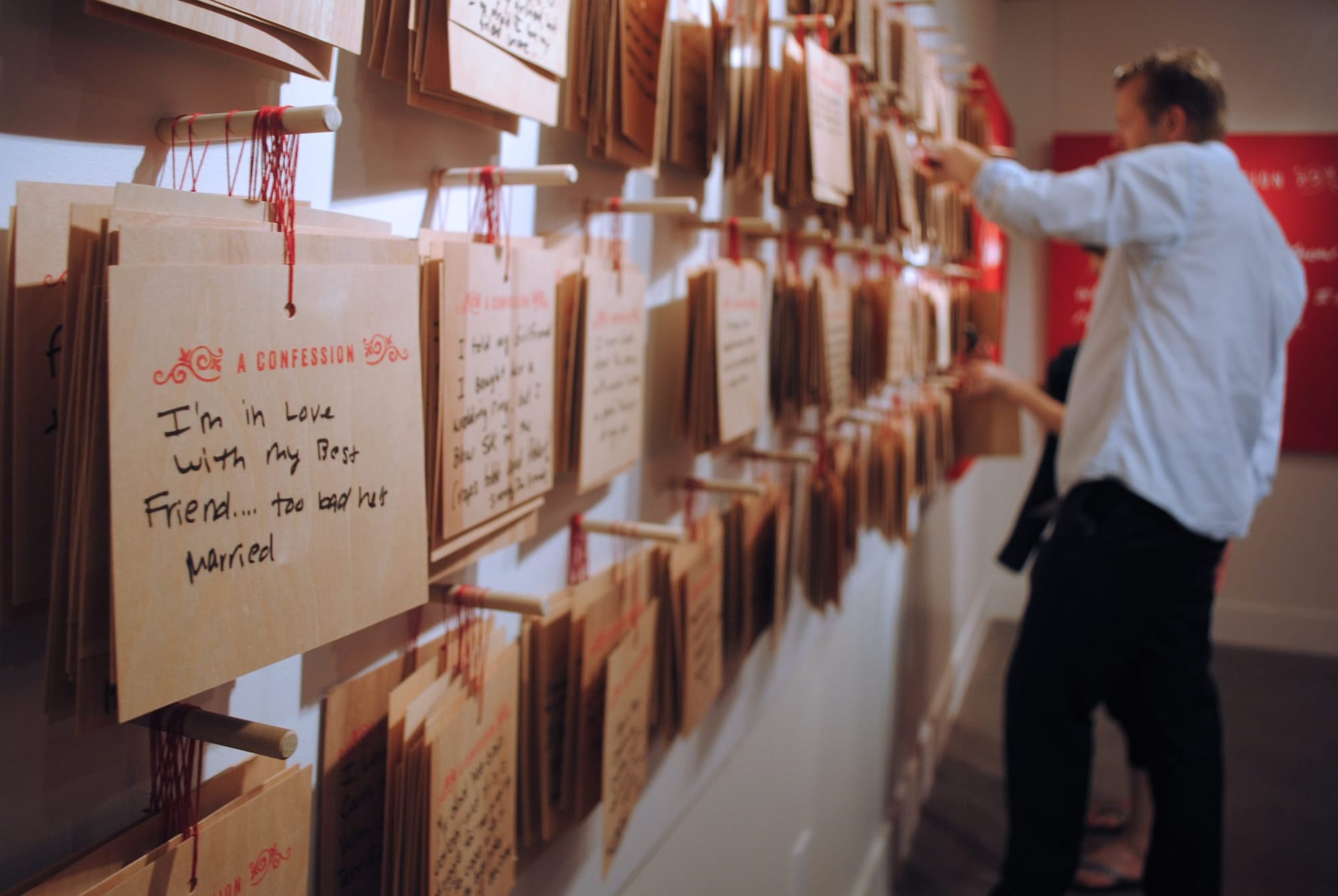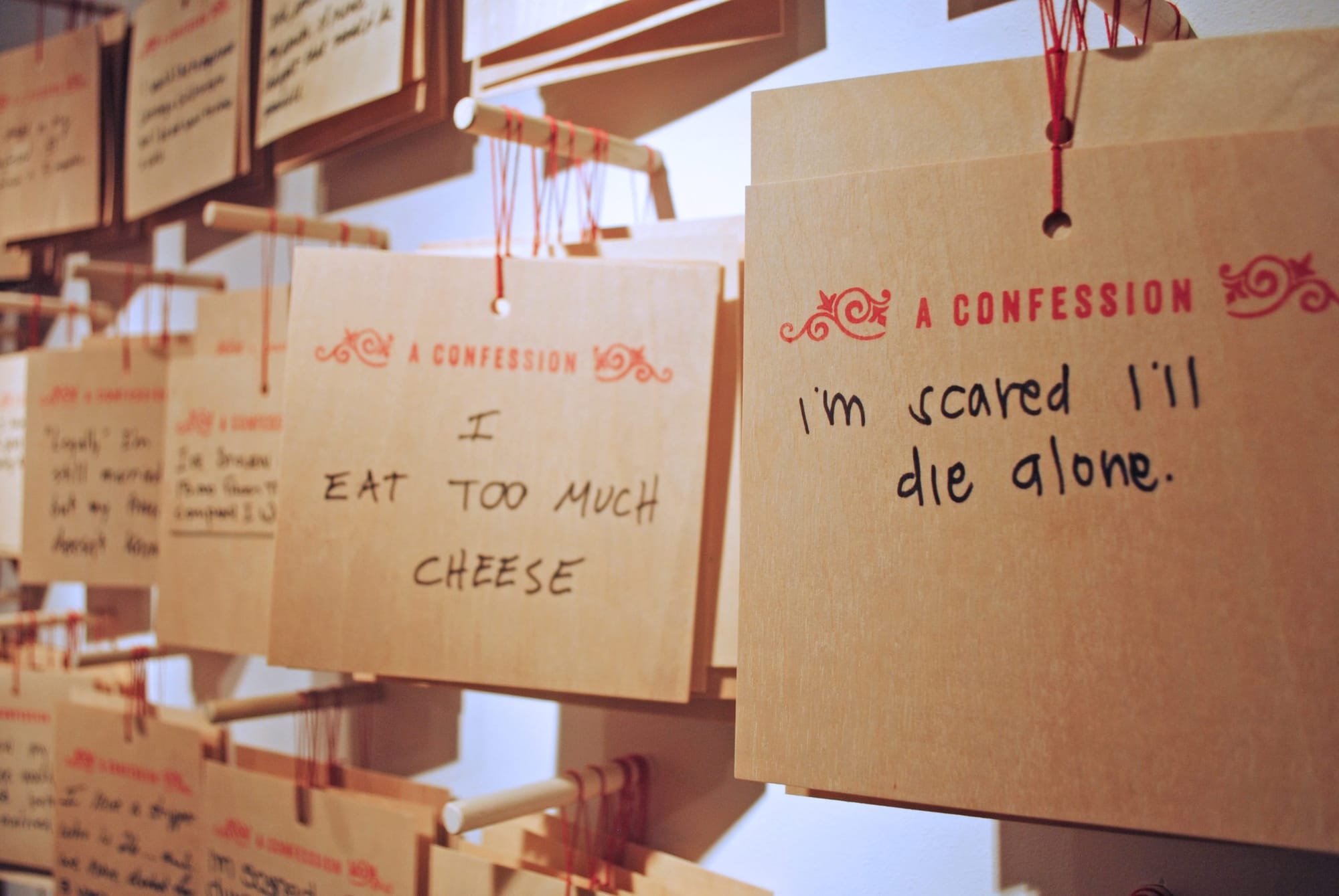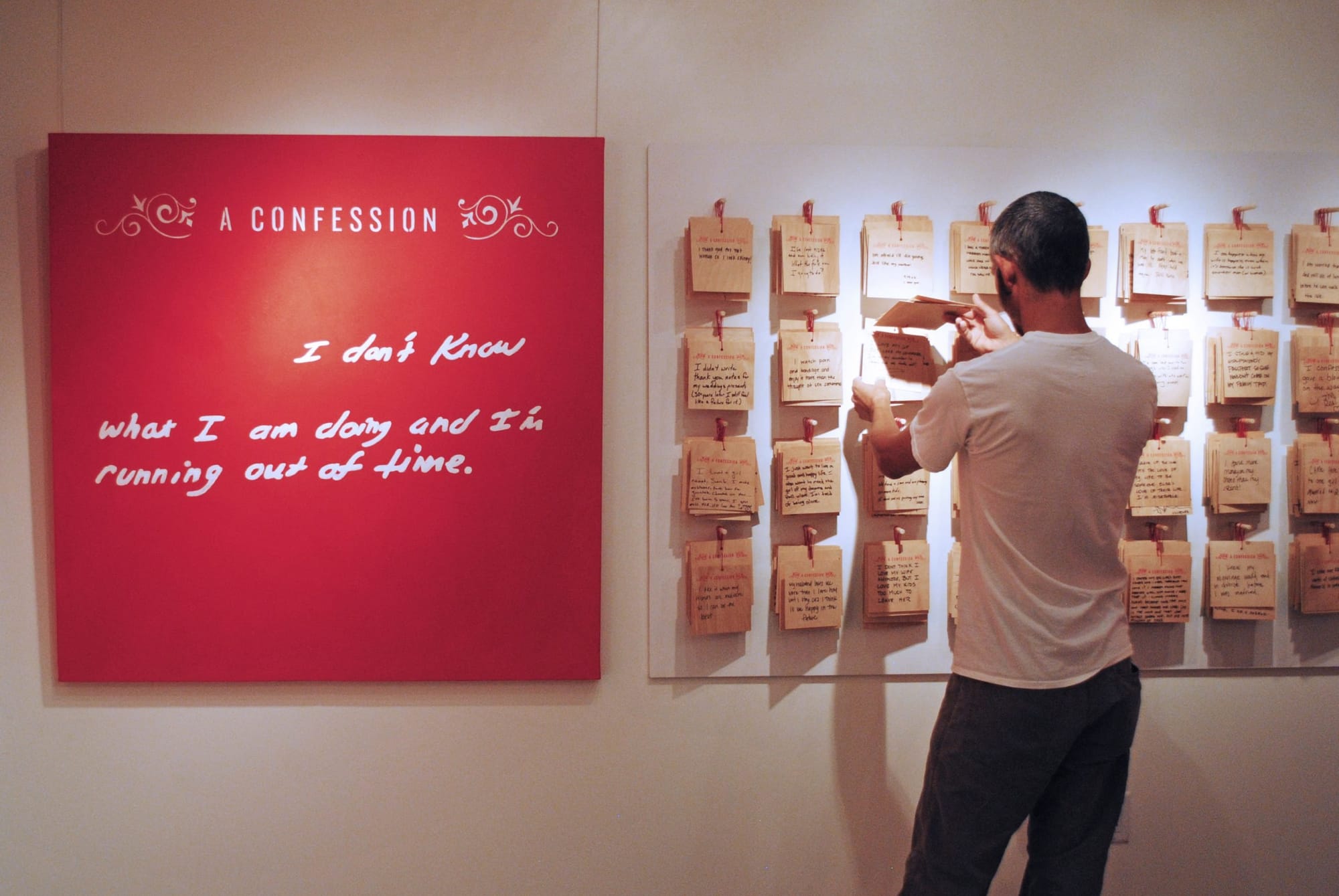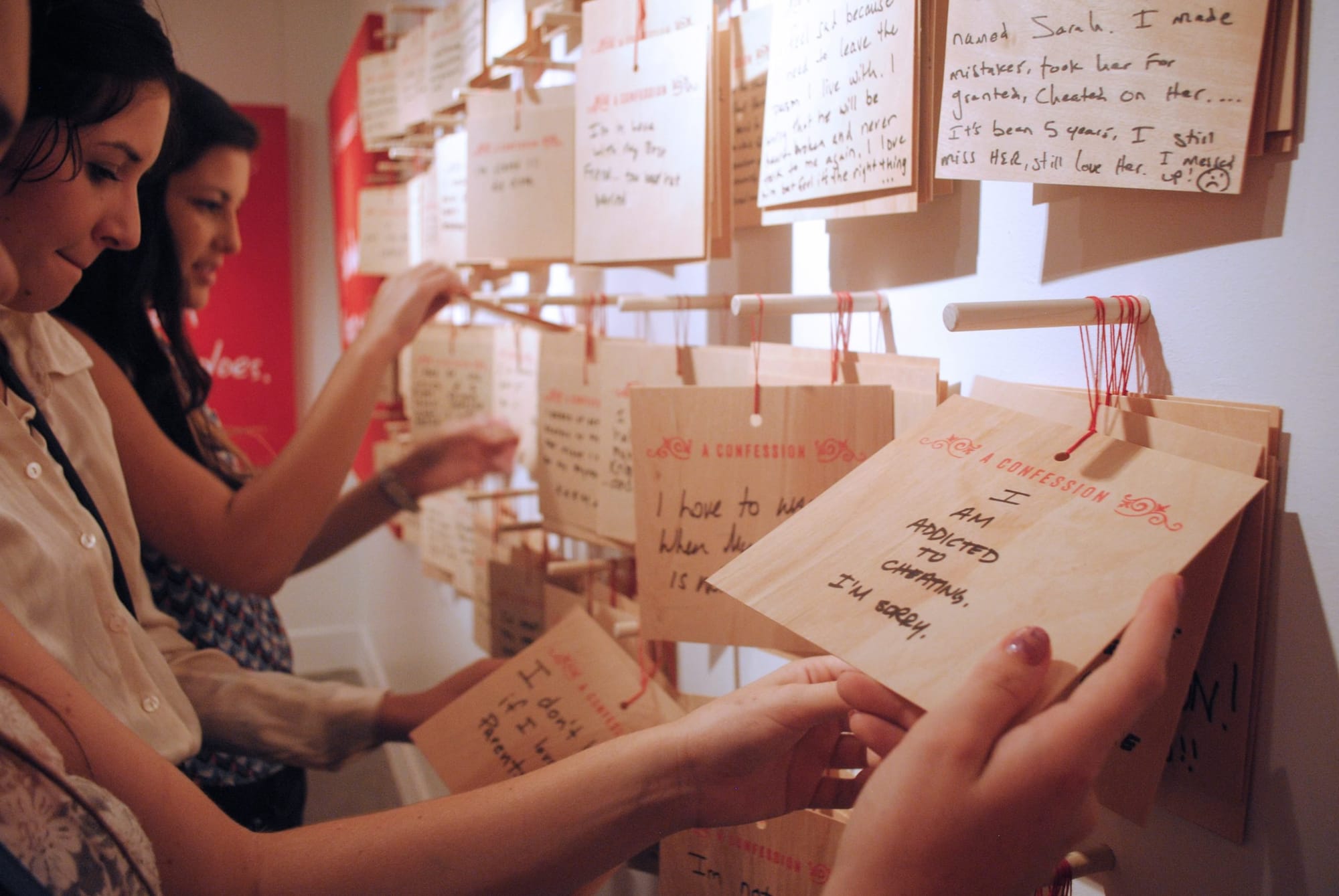 Confessions is a participatory installation that explores public rituals for catharsis and consolation. Informed by Japanese Shinto shrine prayer walls and the practices of Catholicism, Chang invited passersby to write a confession on a wooden plaque in the privacy of confession booths. She then hung the anonymous plaques on the gallery walls. The original exhibit in The Cosmopolitan in Las Vegas collected over 1,500 confessions and included an original soundtrack by Oliver Blank. The installation has since grown to over 20,000 confessions in other cities, including London, England; Athens, Greece; Yerevan, Armenia; San Diego, California; Scottsdale, Arizona; and Minsk, Belarus. Reappropriating religious rites for secular environments, the work examines the relationship between public space and emotional communion.