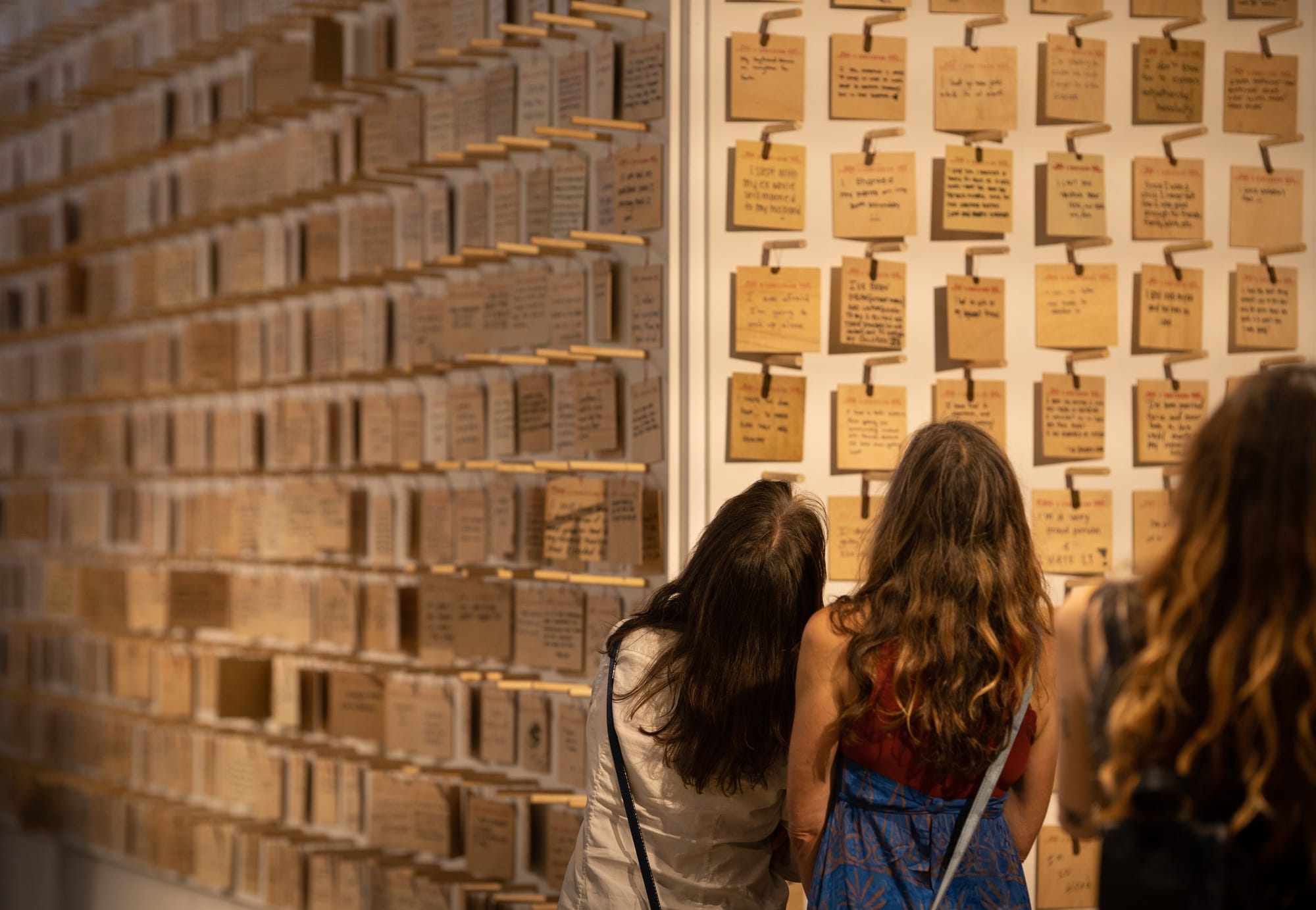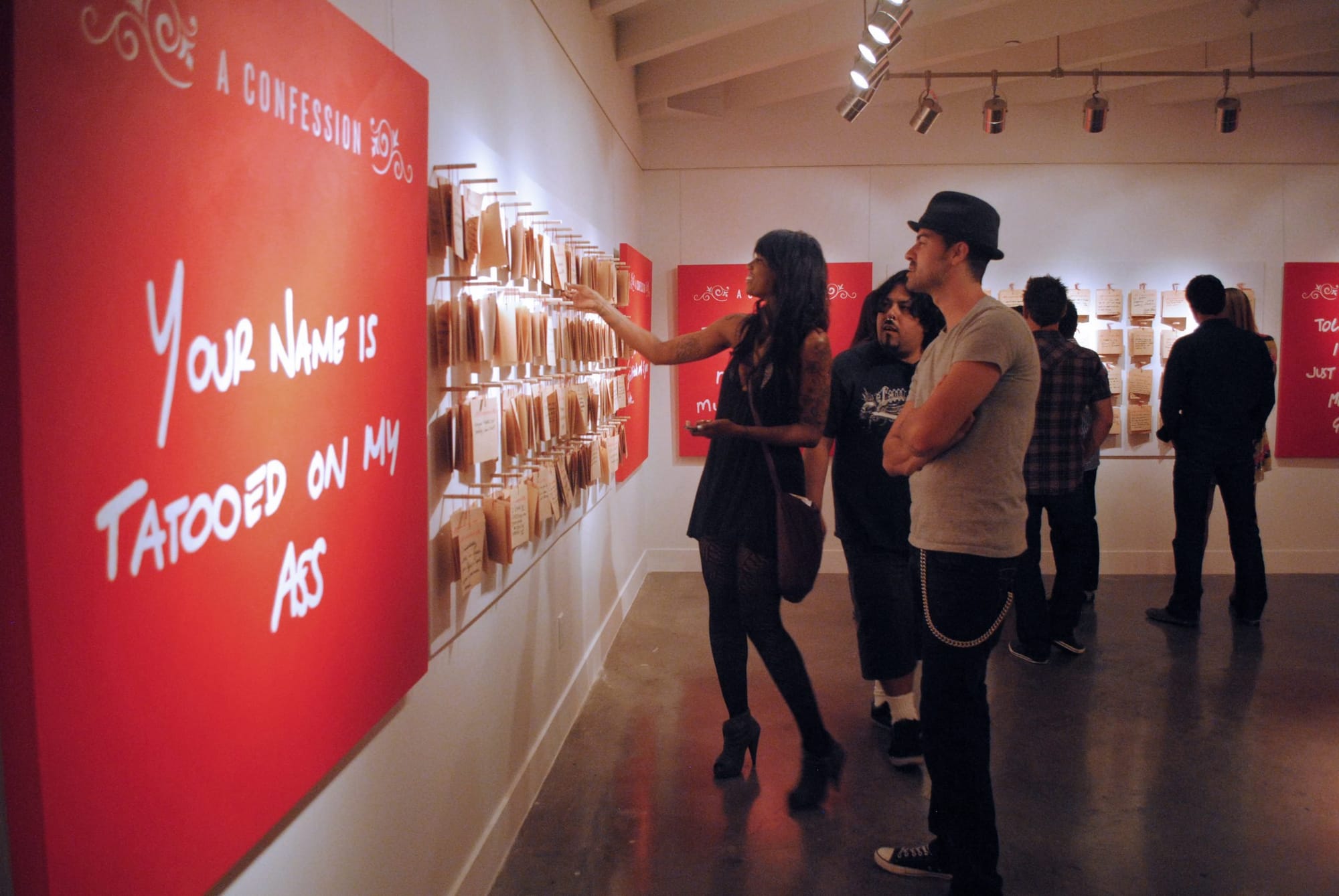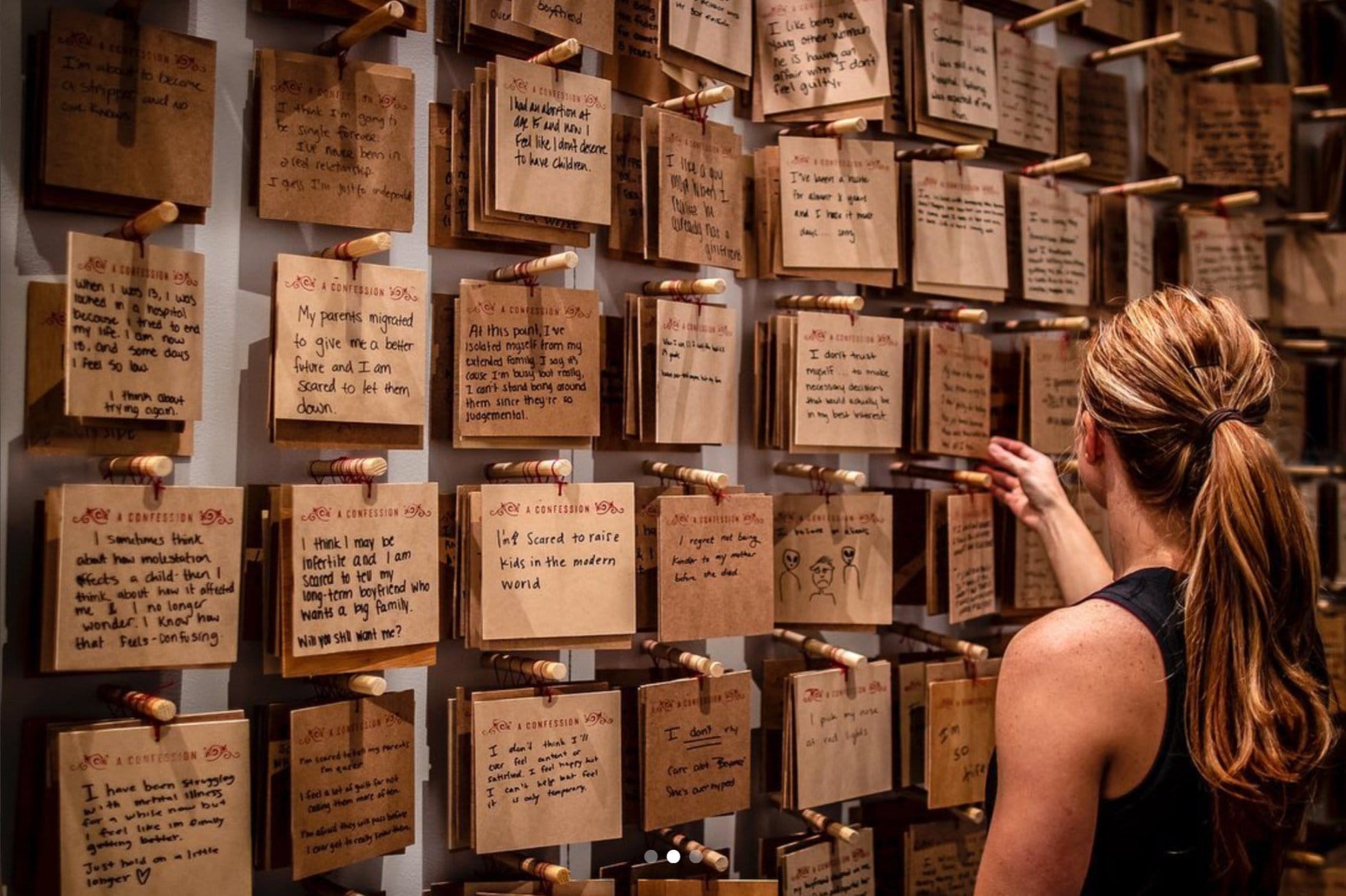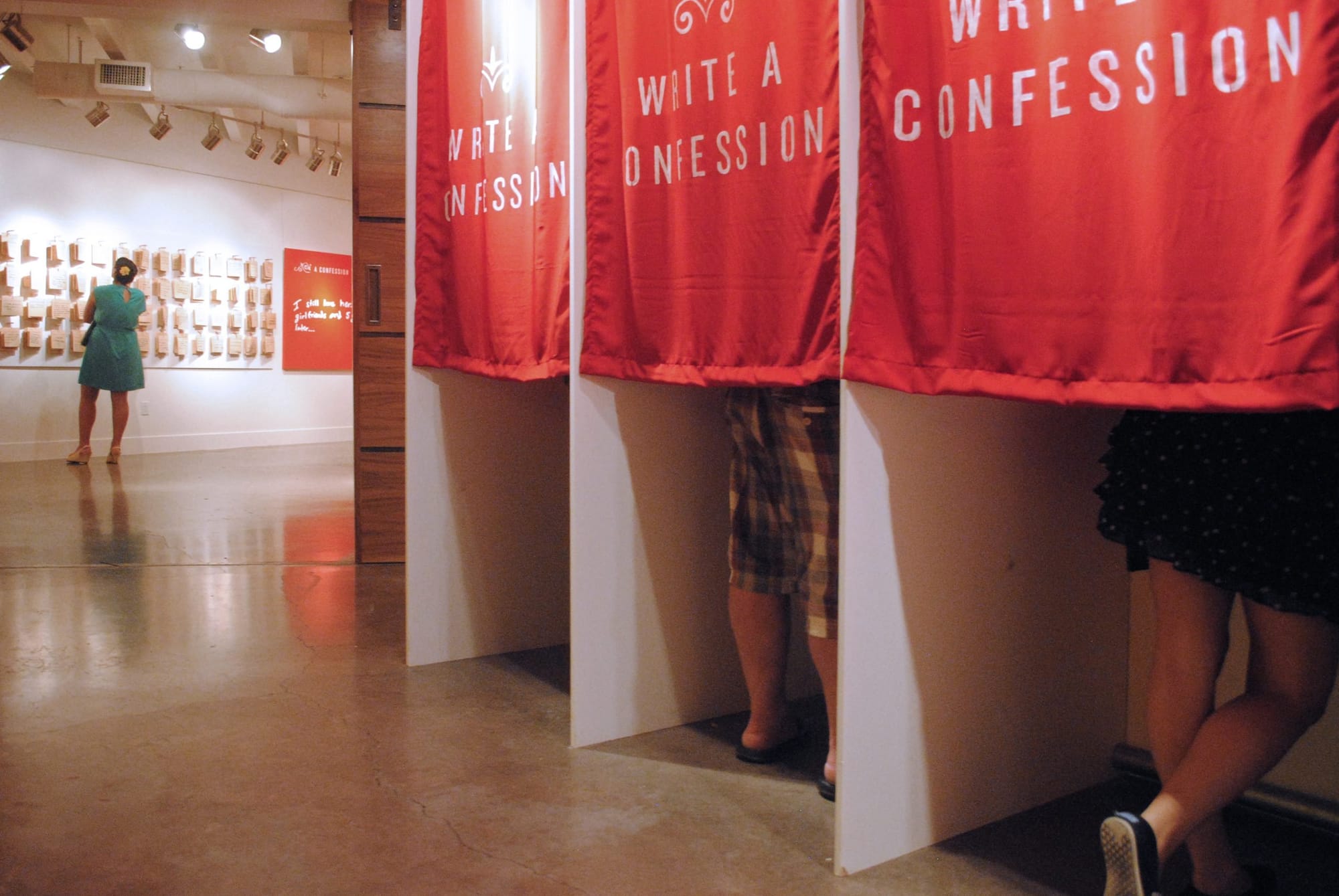 Confessions is a participatory installation that explores public rituals for catharsis and consolation. Informed by Japanese Shinto shrine prayer walls and the practices of Catholicism, Chang invited passersby to write a confession on a wooden plaque in the privacy of confession booths. She then hung the anonymous plaques on the gallery walls. The original exhibit in The Cosmopolitan in Las Vegas collected over 1,500 confessions and included an original soundtrack by Oliver Blank. The installation has since grown to over 20,000 confessions in other cities, including London, England; Athens, Greece; Yerevan, Armenia; San Diego, California; Scottsdale, Arizona; and Minsk, Belarus. Reappropriating religious rites for secular environments, the work examines the relationship between public space and emotional communion.