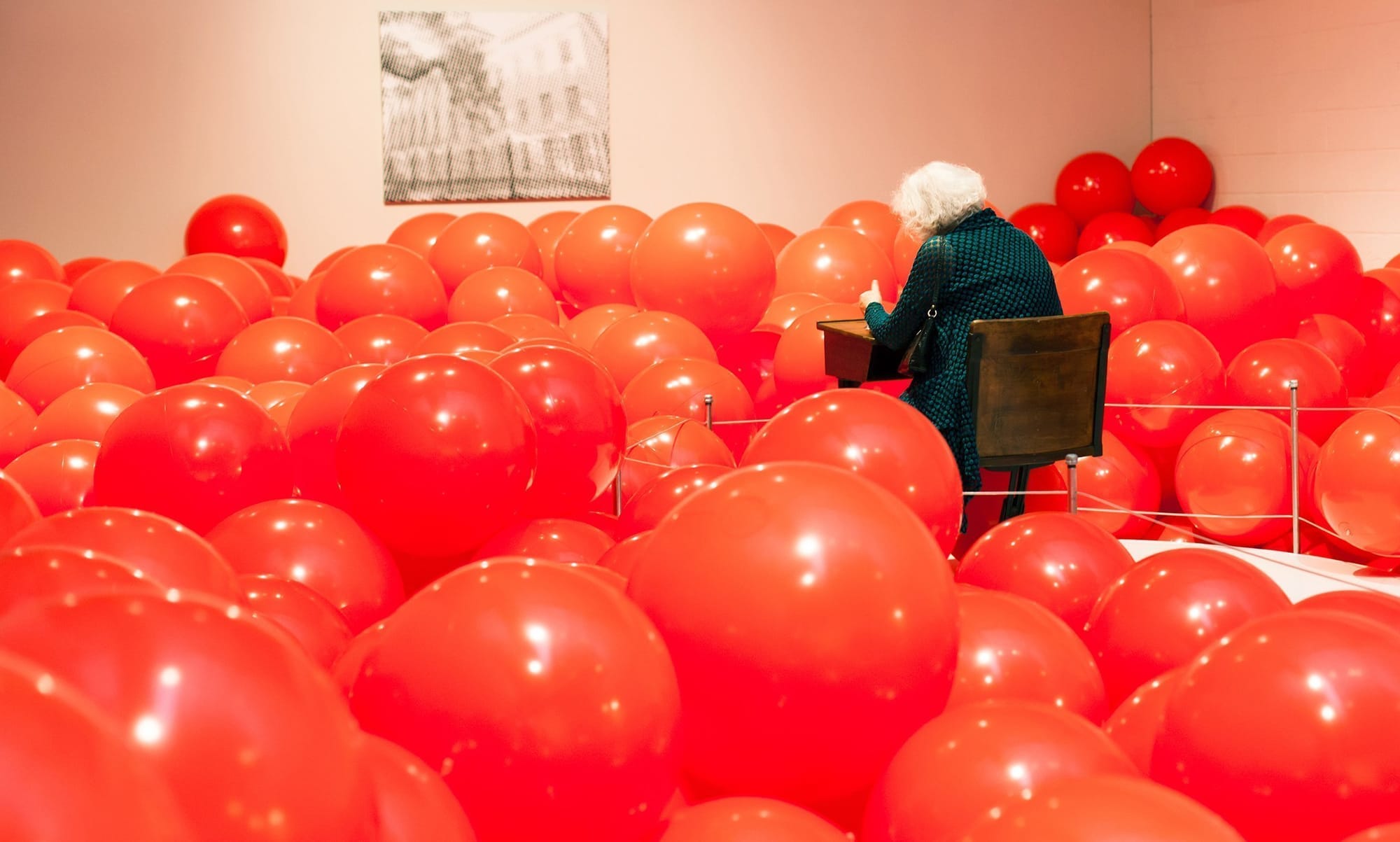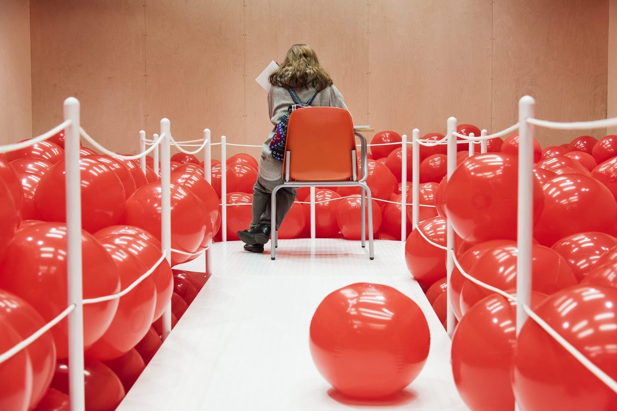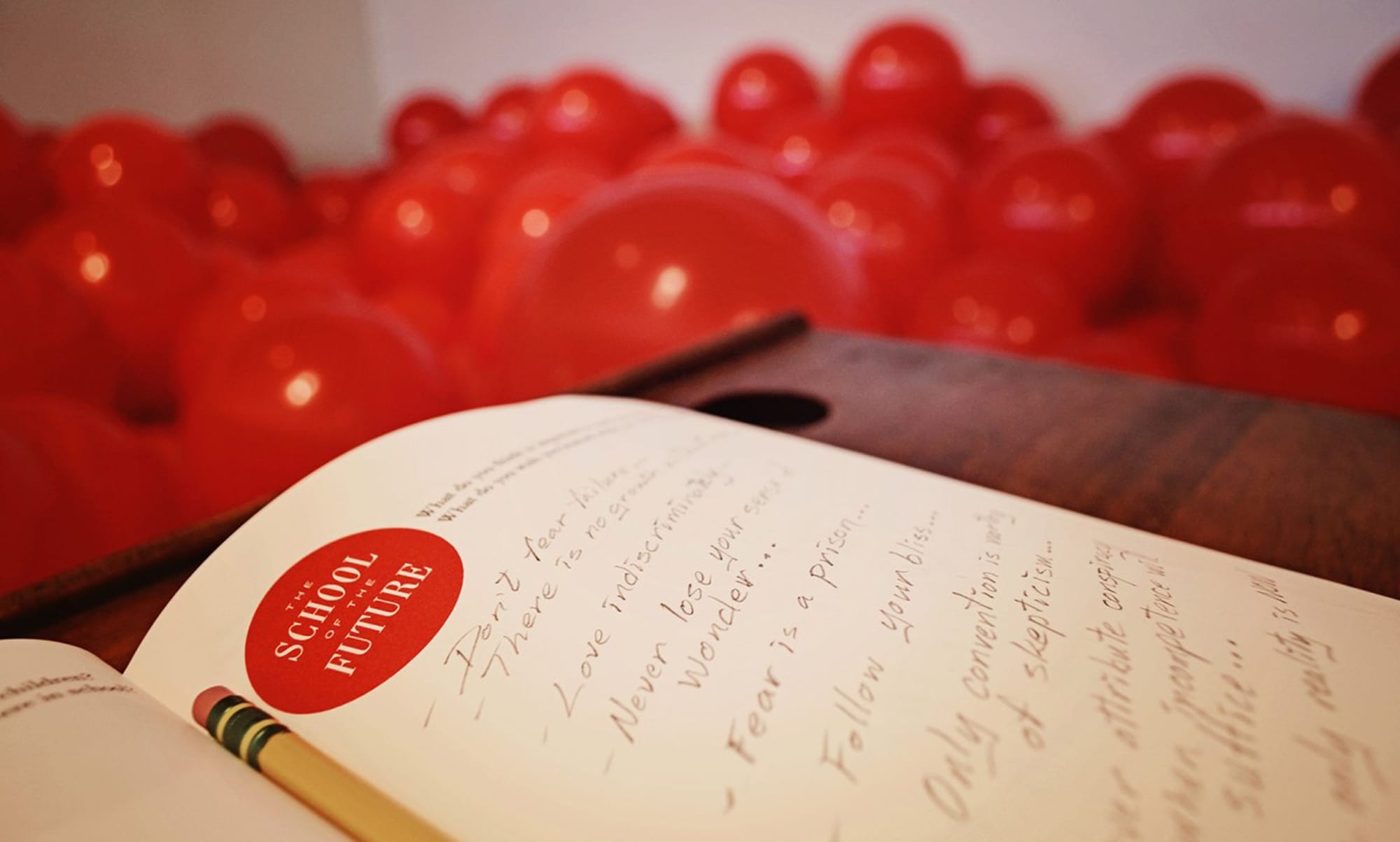 School of the Future is a participatory installation that explores what we value in an education. Visitors find themselves in a space with a school desk at one end surrounded by thousands of inflatable, red balls. A notebook on the desk asks, “What do you wish you learned in school?” A classroom reinterpreted without books, pupils, or students, the installation was informed by the first public school in Alabama, abandoned and under discussion two blocks from the gallery,