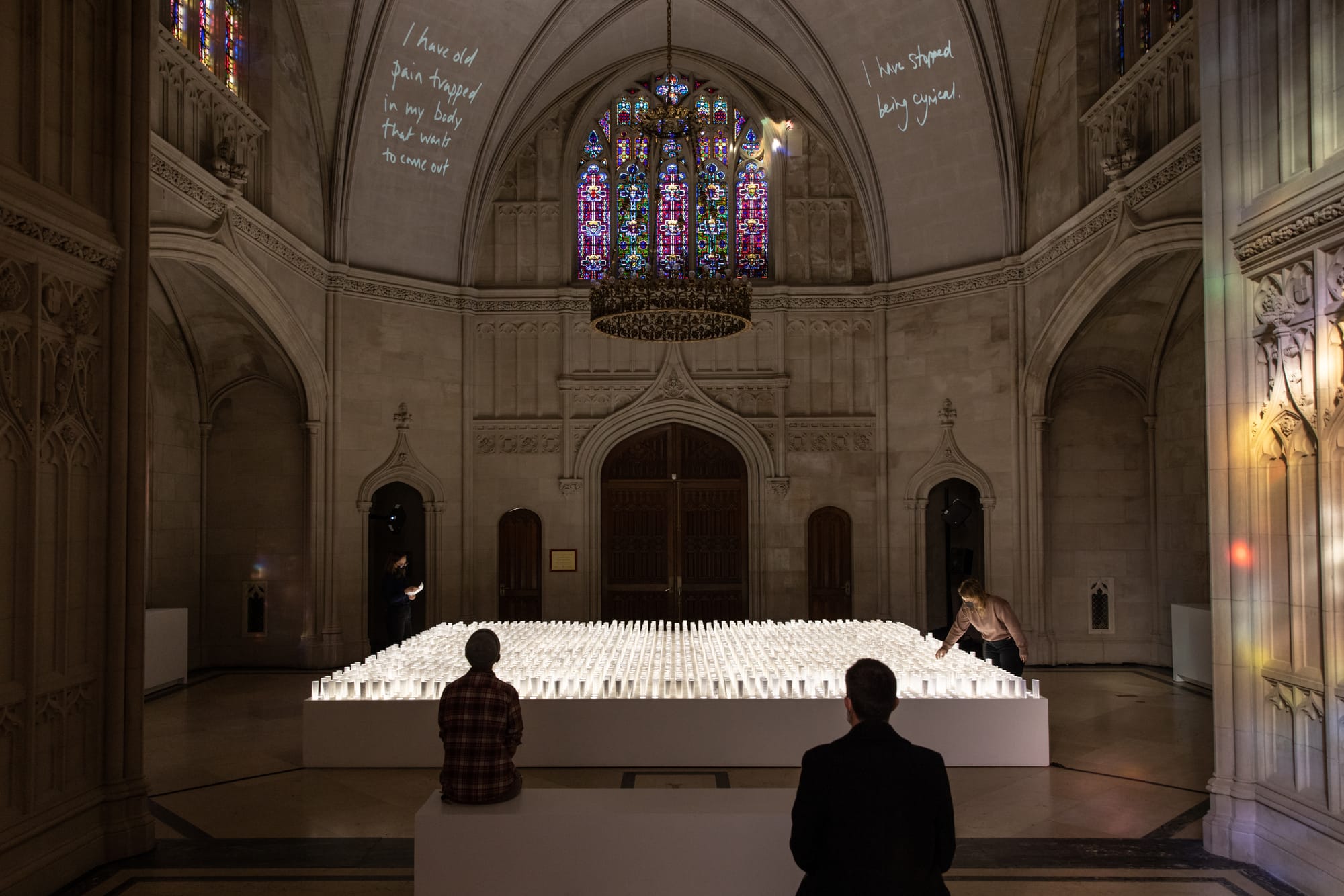 After the End reimagines the cemetery as a site for reflecting on the multiple endings and beginnings throughout life. Sited in Green-Wood Cemetery’s historic chapel, the participatory installation is dedicated to contemplating loss in all forms—the loss of loved ones, relationships, health, and worlds we once knew—as well as the practices that have helped us endure. Visitors were invited to anonymously share their experiences with loss on a scroll and place it upon an illuminated altar. Visitors could read others’ reflections or sit in the apse and watch an ever-growing cycle of projected reflections above while oriented towards the greater community. Set to an original ambient score by Stephen Baker, the installation was inspired by the role of devotional candles in religious ceremonies and selected as a 2021 New York Times Critic’s Pick. Created in collaboration with James A. Reeves, the work gathered the multiplicity of ways we weather the difficult transitions in our lives as we mourn the end of one reality and enter the next.