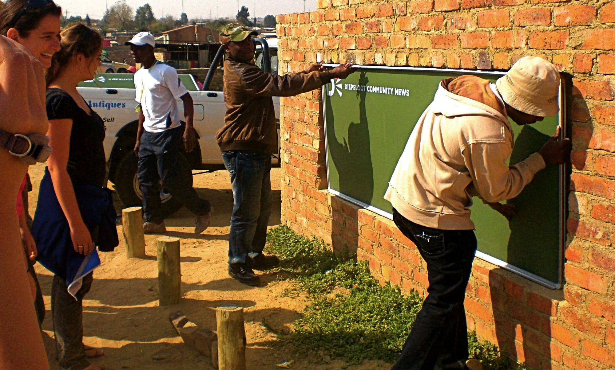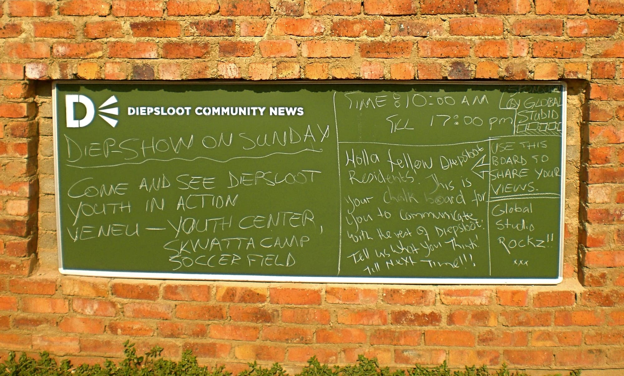 As a graduate student of Urban Planning at Columbia University, Chang had the opportunity to learn and collaborate with community groups alongside international architecture and urban design students through Global Studio. Working closely with Diepsloot Community News, Chang helped create public chalkboards in Diepsloot township in Johannesburg to provide residents with a free platform to easily share information and self-organize. After a young girl was lost in the township, local resident and Diepsloot Community News founder Bongani Baloyi observed the struggles in spreading the word. She was safely found days later and this experience became inspiration for the project. Inspired by a community-related chalkboard in Liberia by Alfred Sirleaf, these flexible forums have been used for various purposes, including publicizing events, posting jobs, and gathering contact information for community advocacy groups.