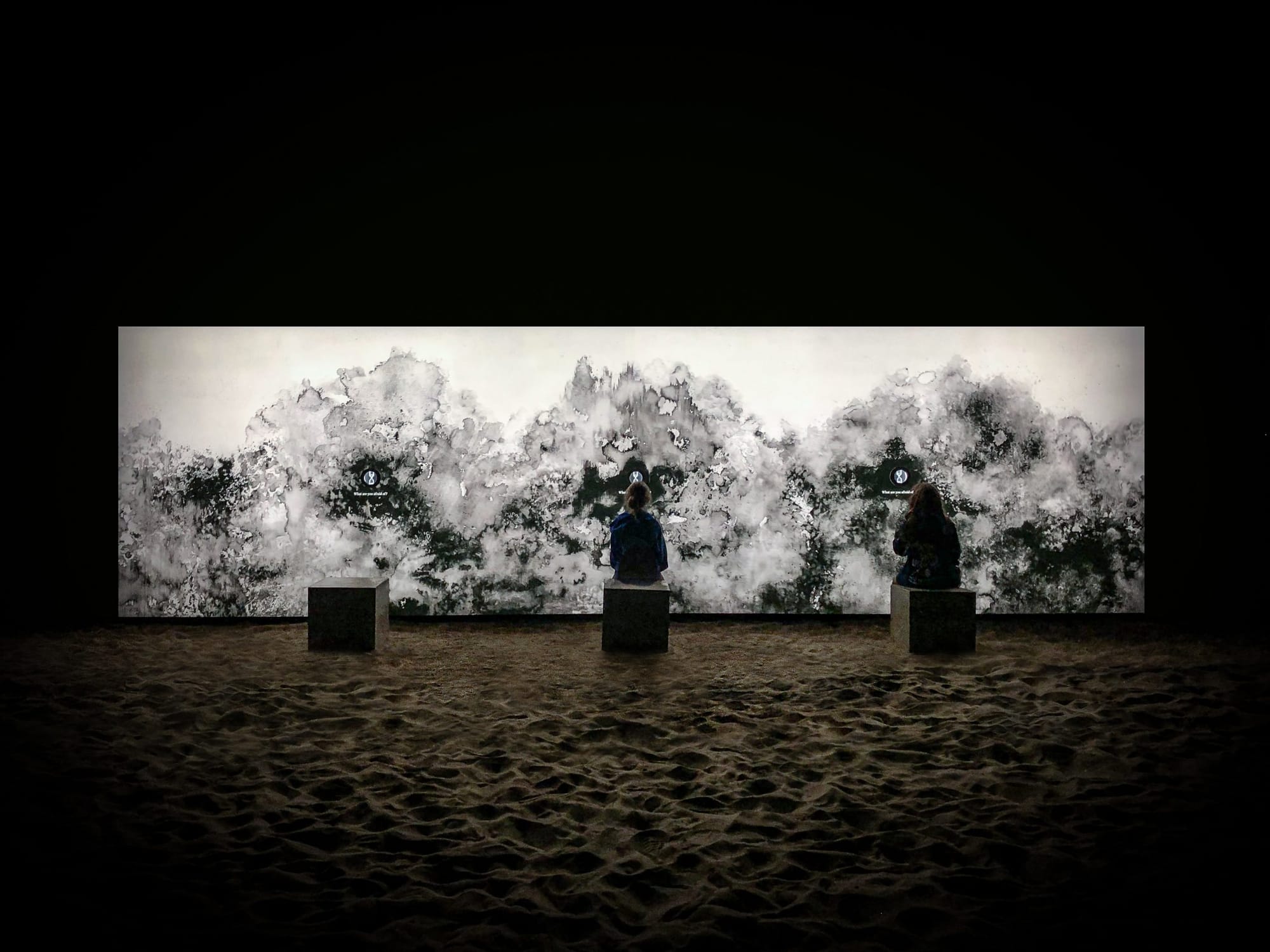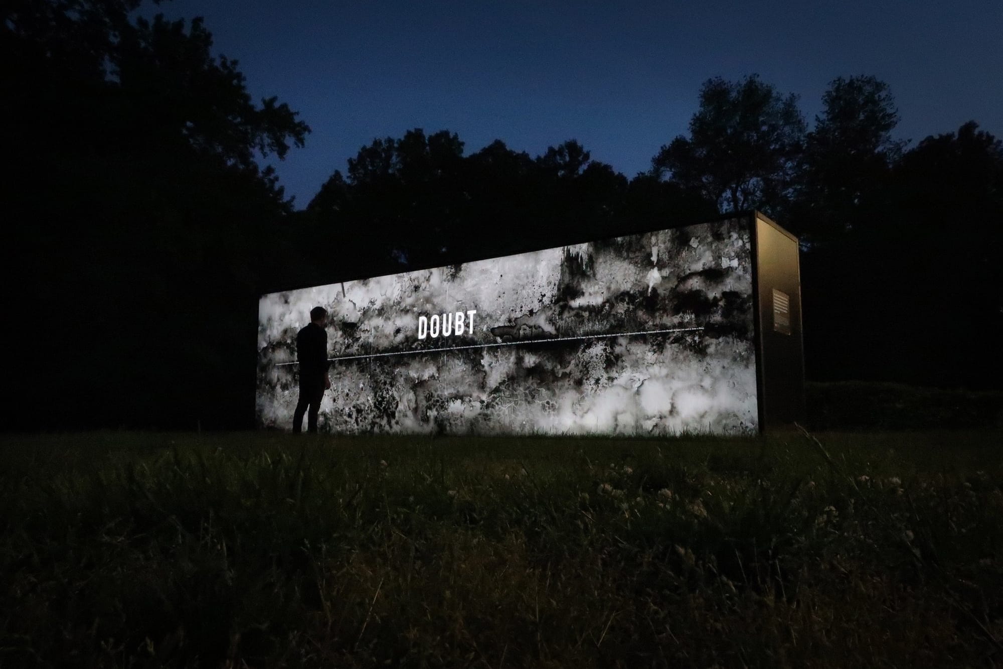2019, The Annenberg Space for Photography, Los Angeles, California; 2021, The Mint Museum, Charlotte, North Carolina. 8′ h x 27′ w x 3′ d lightboxes; 21′ x 18′ gallery installation. Lightboxes: Solar panels, aluminum, polycarbonate, vinyl, LED lights, hourglasses, concrete, ink. Gallery: concrete, projection, audio, paper, pens. Commissioned by Katie Hollander, exhibition curation by Jen Sudul Edwards, project management by Stephanie Brown.