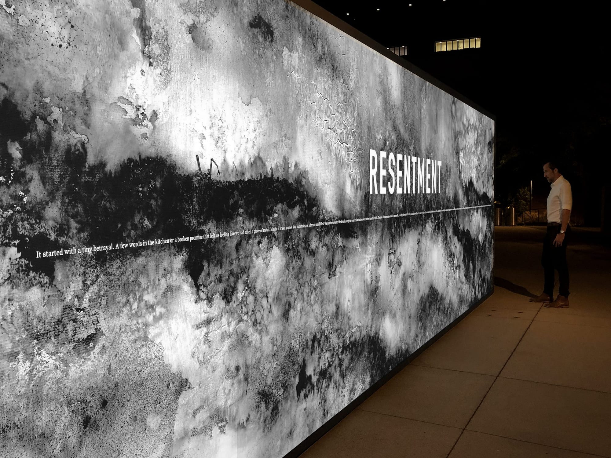 Light the Barricades is a series of three electrified shrines that reimagines the wall as a site for contemplating inner obstructions. Combining the anatomy of billboards with the traditions of Chinese landscape painting and meditation, the installations focus on doubt, judgment, and resentment—qualities that increasingly dominate American life today. Passersby are invited to read illustrated fables along the length of the facades before engaging in five-minute reflections on the role we play in our relationships with others and ourselves.