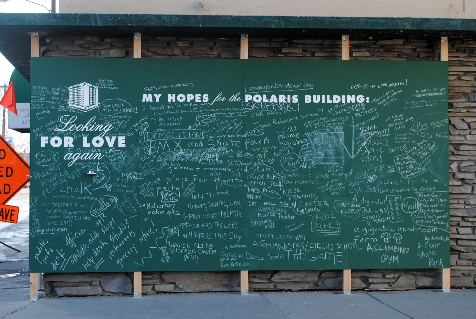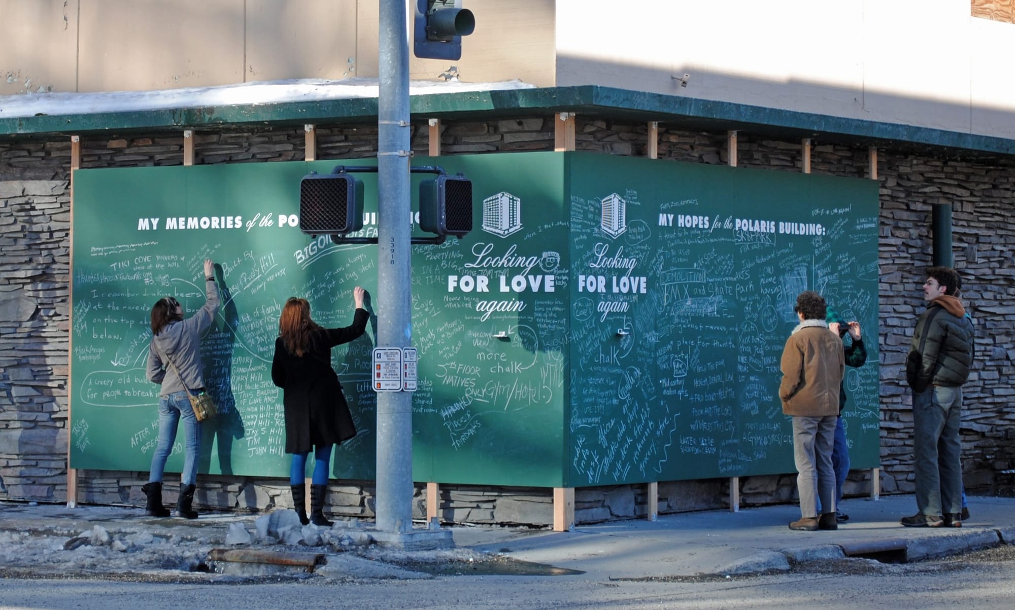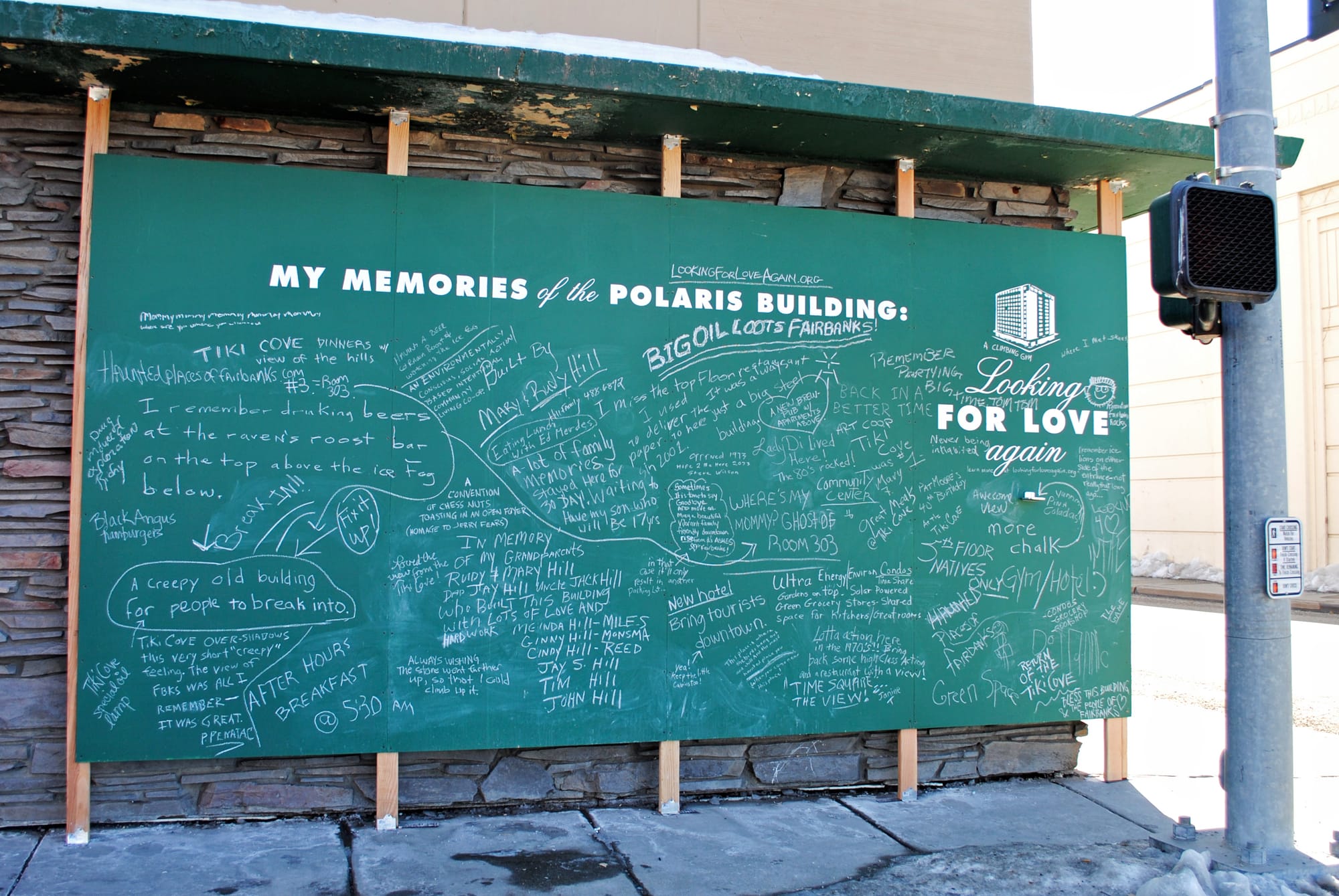 Abandoned buildings have become such a common sight that they often slip quietly into the backdrop of our cities like an accepted part of our landscape. Chang created Looking for Love Again to renew attention to an abandoned high-rise in downtown Fairbanks by transforming it into an emotional beacon pleading for love and inviting people to come in for a closer look. A four-story sign and chalkboards at the street level, as well as an accompanying website, invited people to share their memories of the building and their hopes for its future.