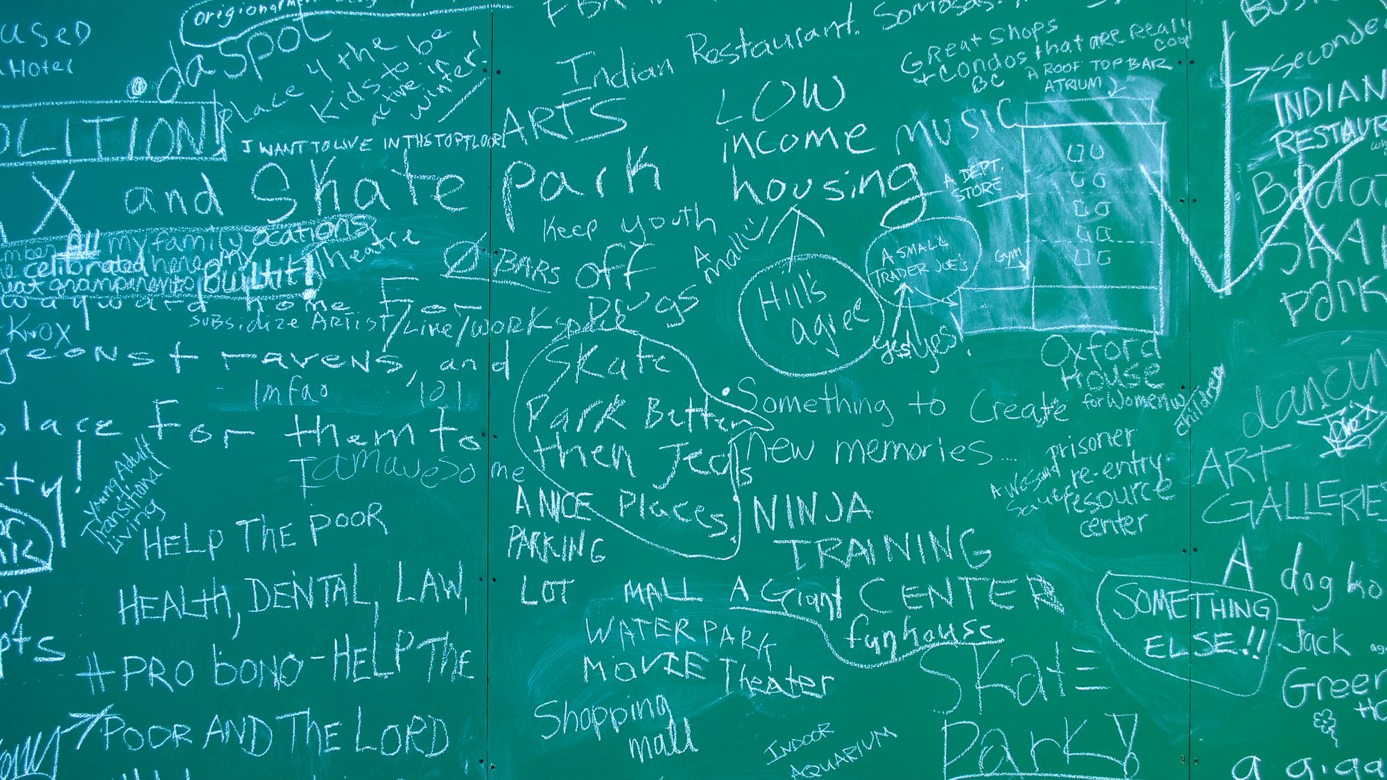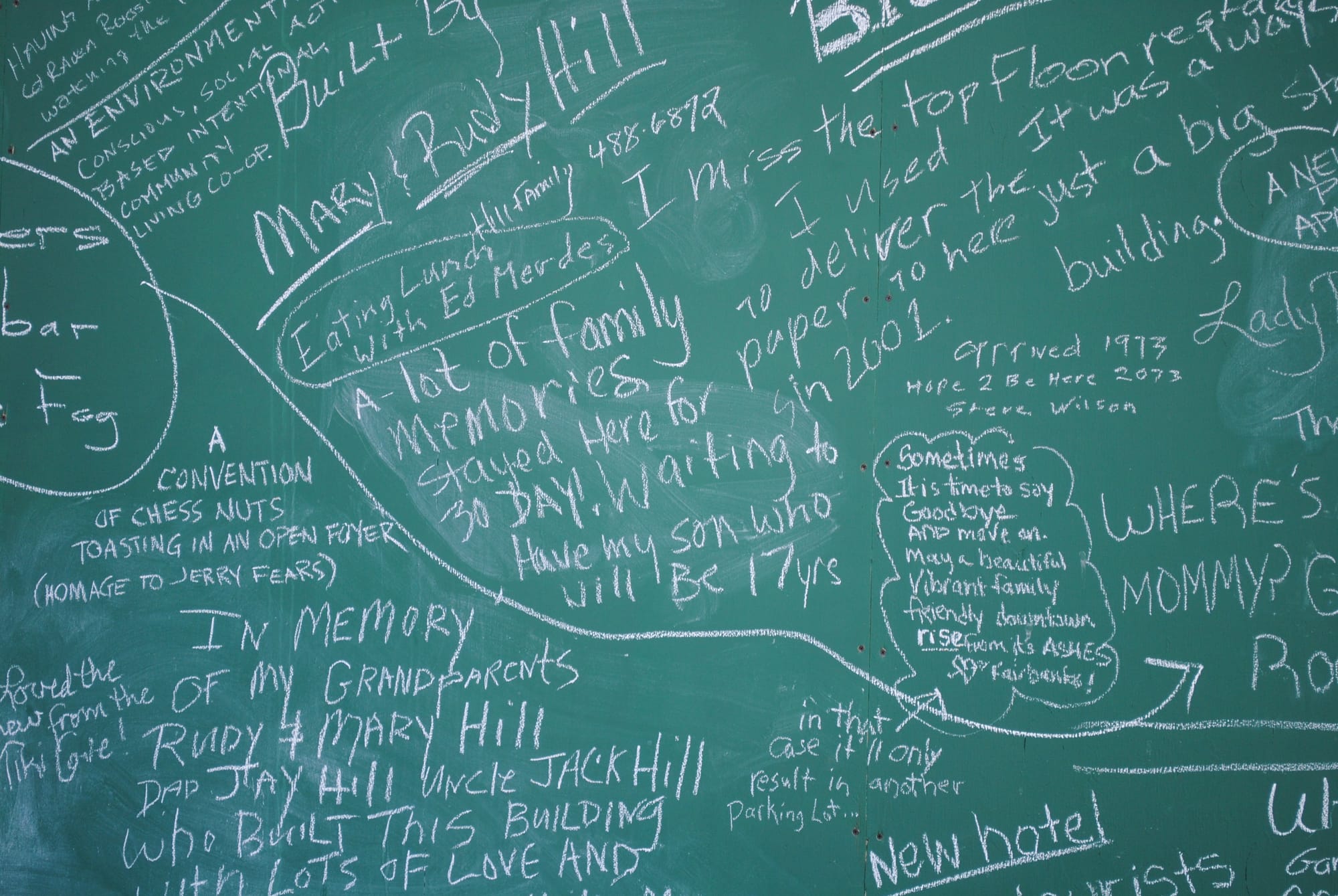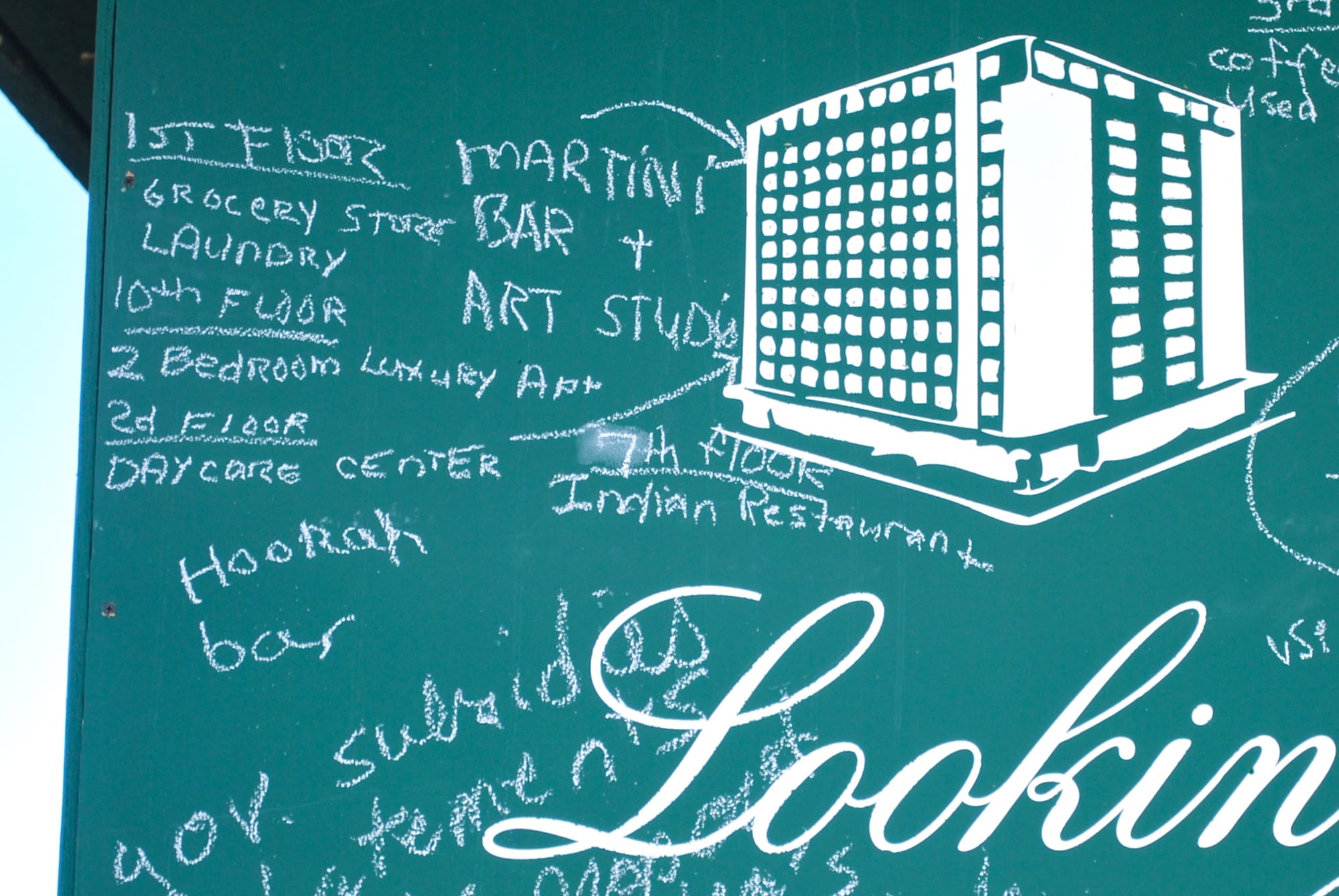Abandoned buildings have become such a common sight that they often slip quietly into the backdrop of our cities like an accepted part of our landscape. Chang created Looking for Love Again to renew attention to an abandoned high-rise in downtown Fairbanks by transforming it into an emotional beacon pleading for love and inviting people to come in for a closer look. A four-story sign and chalkboards at the street level, as well as an accompanying website, invited people to share their memories of the building and their hopes for its future.