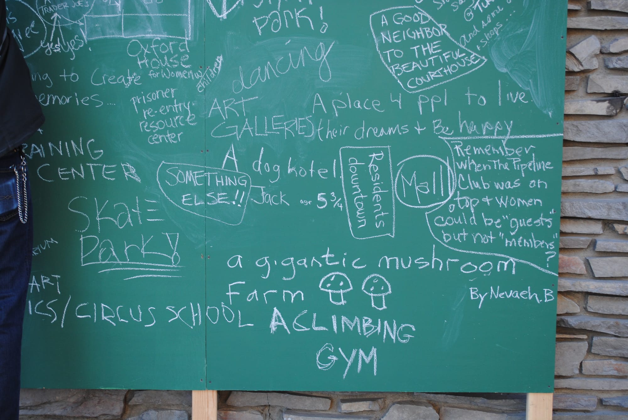2011, Fairbanks, Alaska. Acrylic, industrial fabric, chalkboards, wood, spray paint, chalk. 68’ h x 36′ w signage, 10’ h x 30’ w chalkboards. Project coordination by David Hayden. Project assistance by Mike Hondel. Installation assistance by Bernie Baecker, Carol Hayden, Sean Hering, Kate Incarnato, Galen Lott, Dustin Miller, Jessica Nelson, Amy Nordrum, Ian Oleson, Sheri Oleson, Pat Rivera, Jack Schmid, Trent Schoenemann, Sue Sprinkle, Dave van den Berg, and Jared van deer Weele.