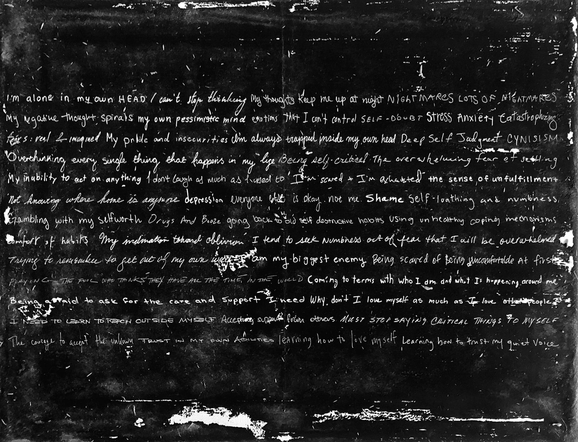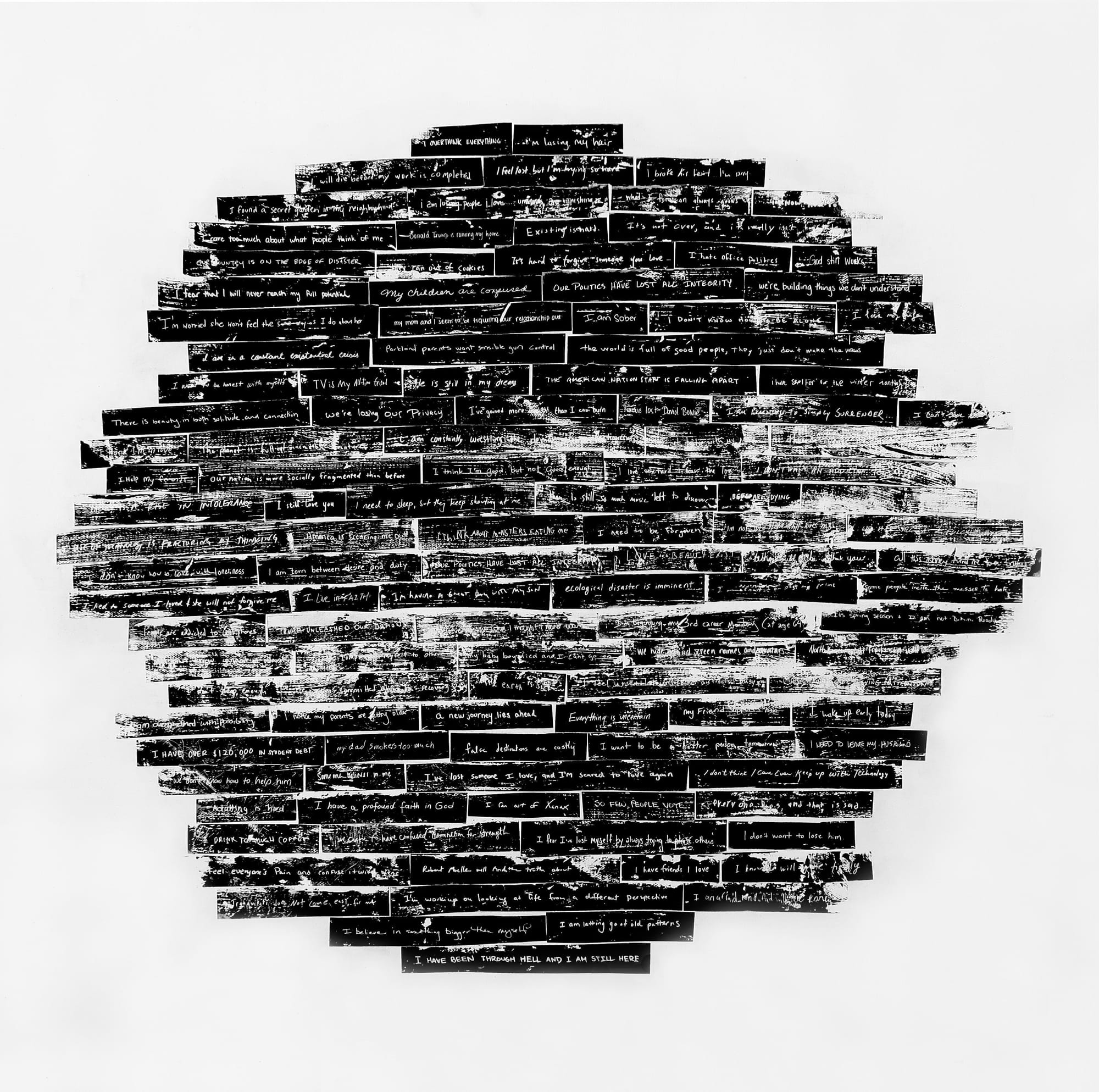 Assembled from visitors’ responses to Chang’s participatory installations, the Mass series features portraits of collective anxieties, pains, insights, and desires that consume society today. Implementing ink transfer techniques, Chang hand-cuts and burnishes each photocopied response, excavating sediments of paper until only black ink remains infused in the canvas. The result echoes traditional Chinese reproductions of venerated texts through ink rubbings, the first "copy machine" of text. The strips of text evoke the shape of redacted words, a practice that originally became widespread in World War II soldiers’ letters home to censor emotions that might hinder faith in war-time efforts. Here, a wide range of emotional testimonies are laid bare in elemental form.