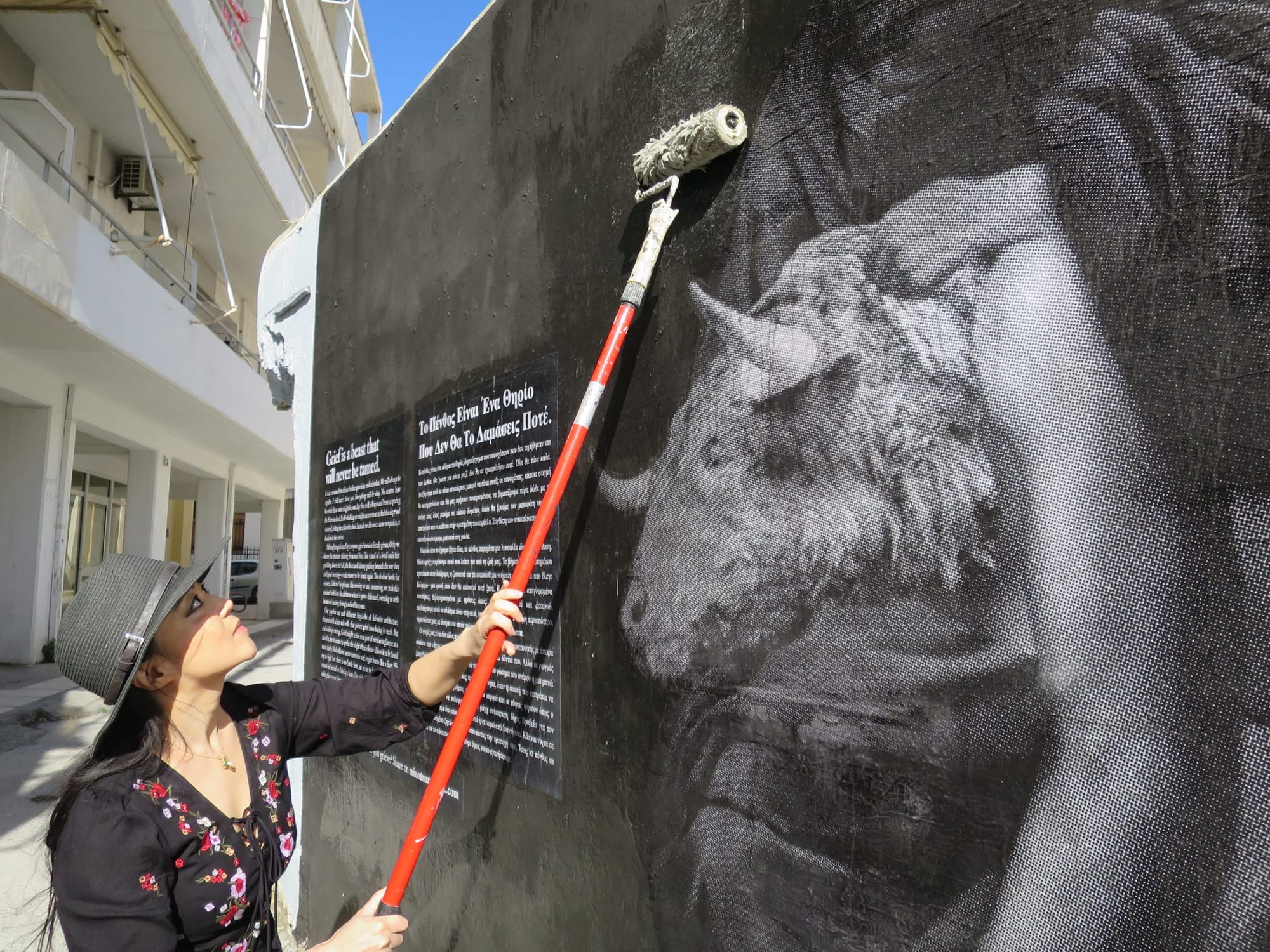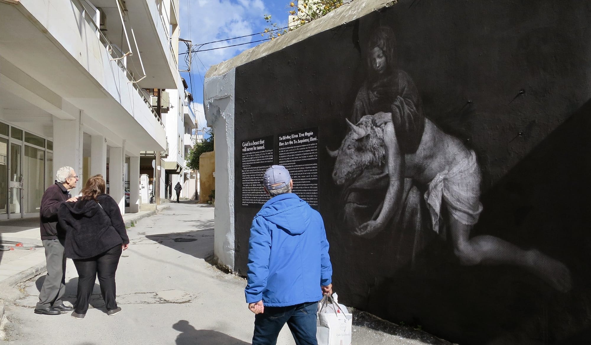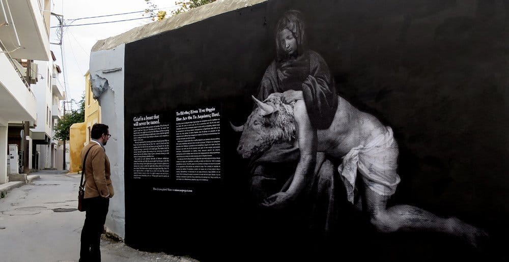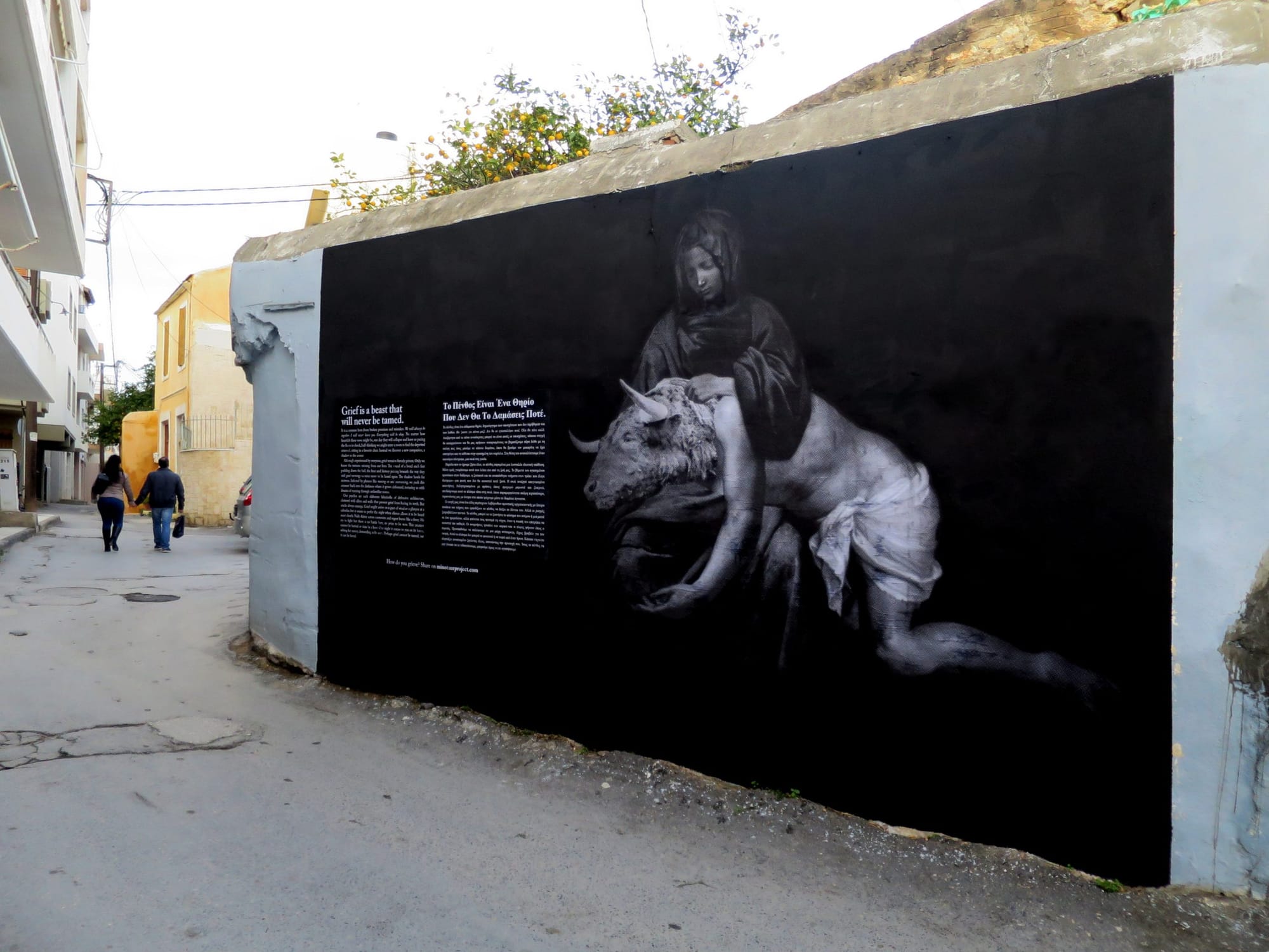 2017, Heraklion, Greece (Giannikou 37 near Kafeneion O Lakkos). Acrylic, paper. 3 m h x 5.5 m w / 18' w x 10' h. Greek translation by Antonis Tsirikoudis. With support from the Lakkos Artist Residency. The collage for Grief Is a Beast That Will Never Be Tamed is built from pieces of several Renaissance and Baroque paintings, including The Entombment of Christ by Giovanni Francesco Barbieri (1656); Salome with the Head of John the Baptist by Caravaggio (1609); and Michelangelo's Pietà (1499).