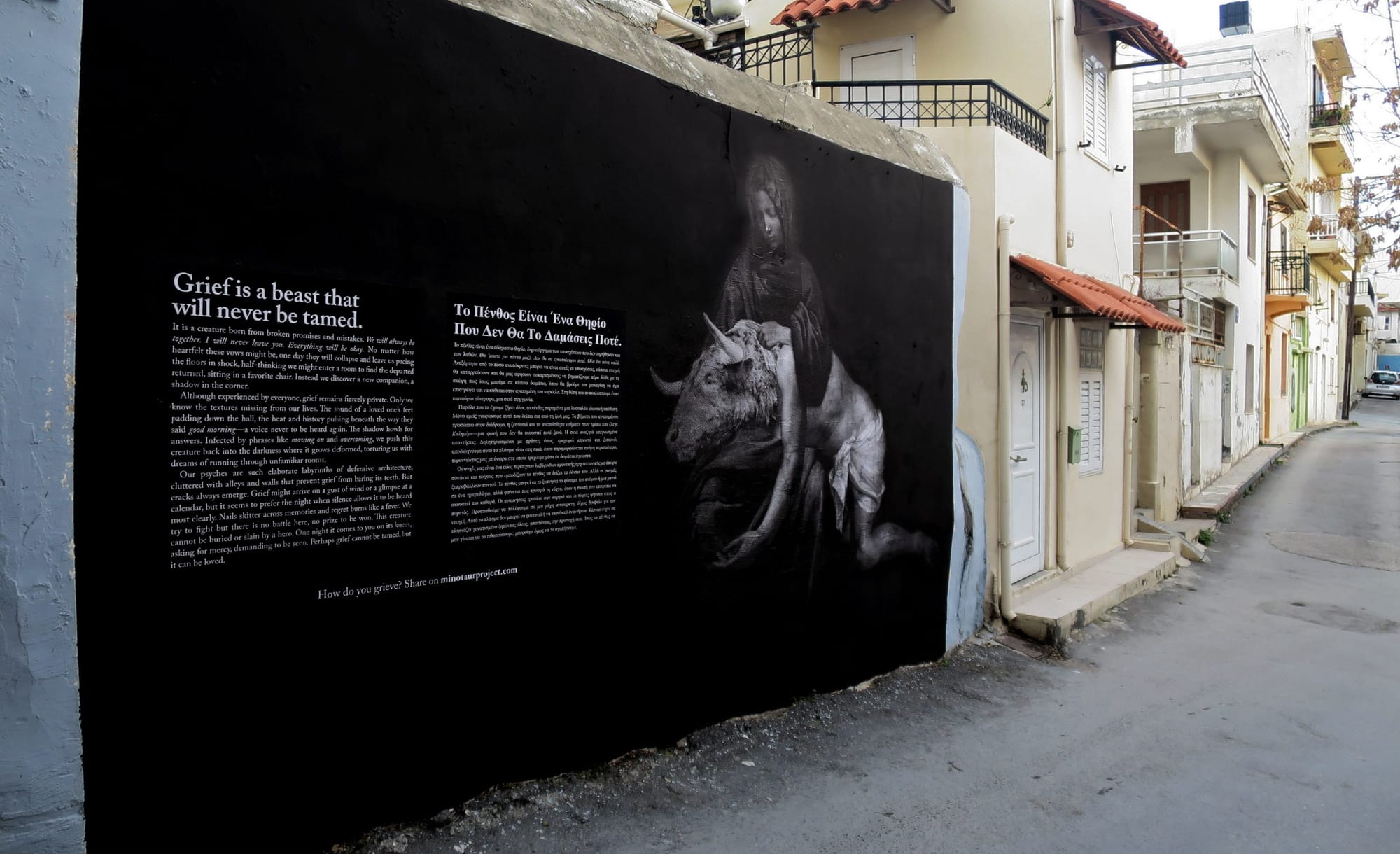 Grief Is a Beast That Will Never Be Tamed offers a meditation on loss and invites people to share the rituals, practices, and texts that have provided solace. Inspired by the myth of the Minotaur, which originated in Crete, the installation was created in Crete in collaboration with James A. Reeves.