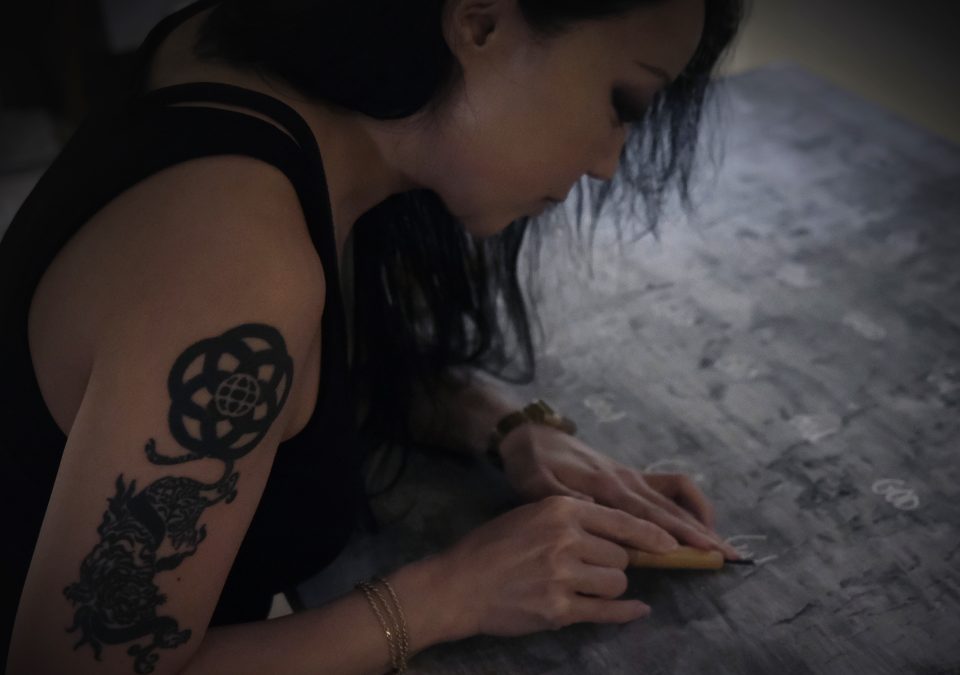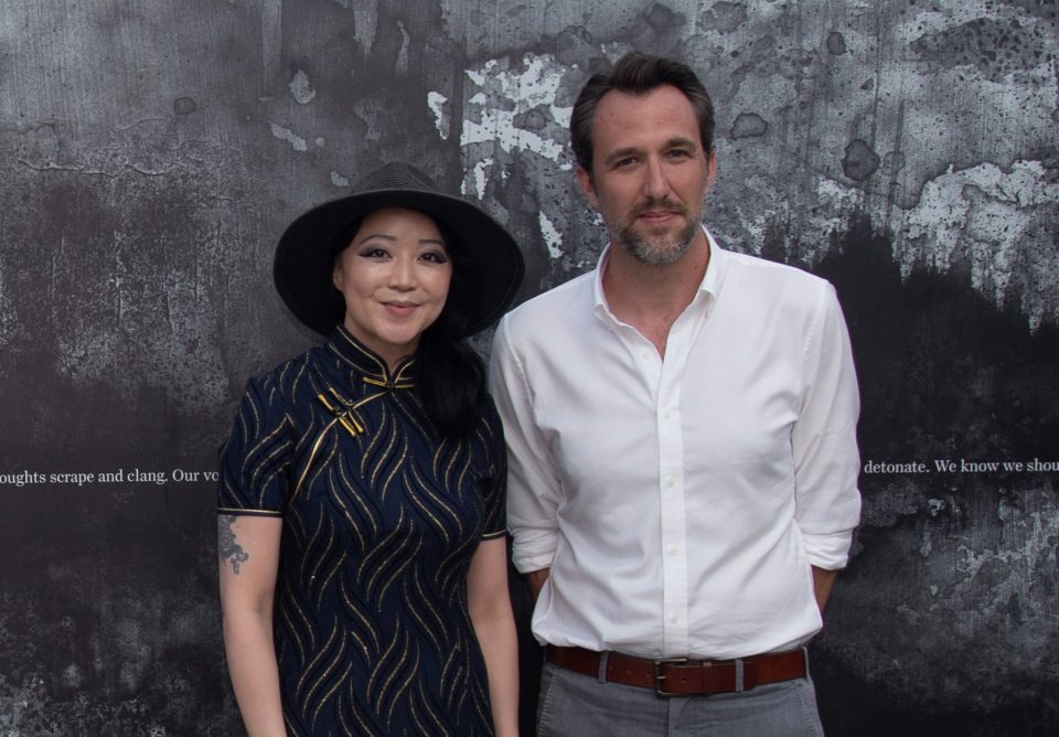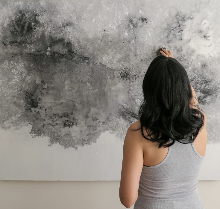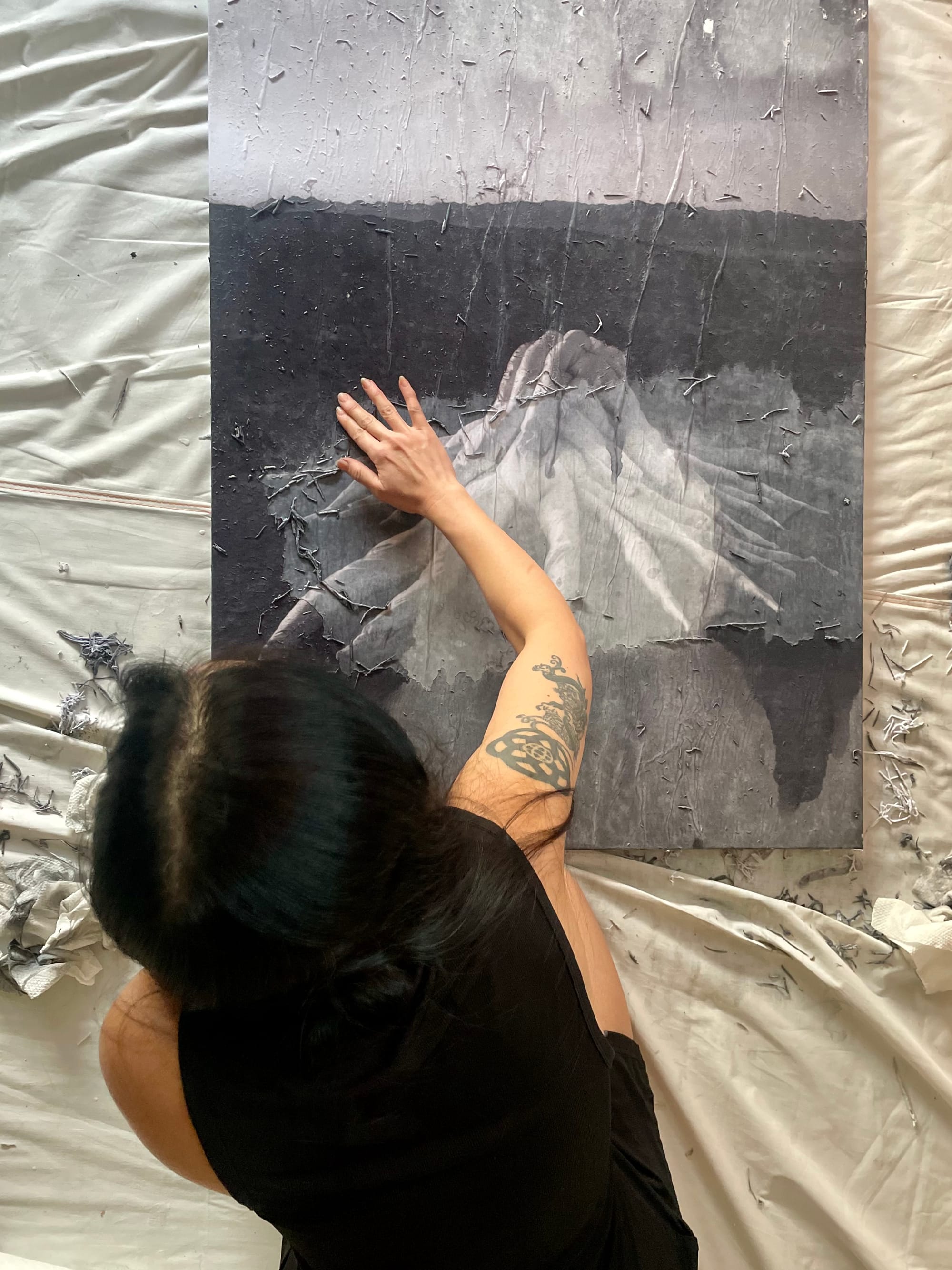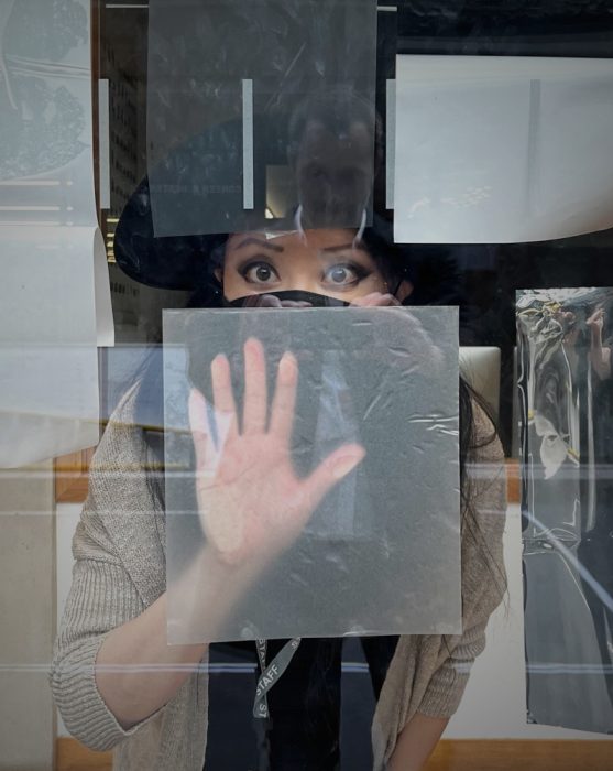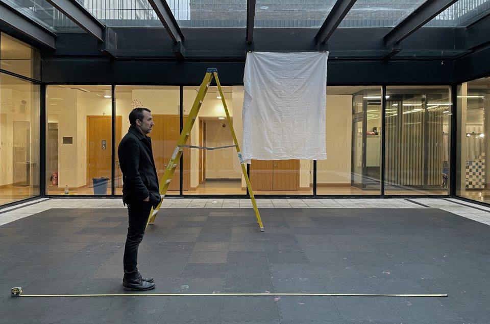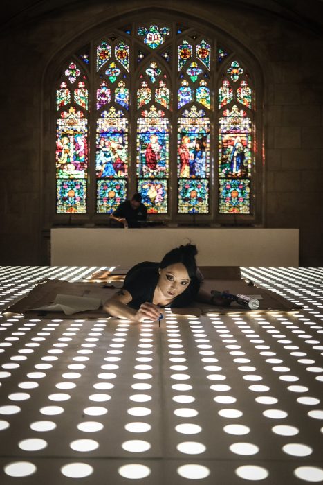 Behind the scenes of After the End at Green-Wood Cemetery in Brooklyn, New York in 2021. James and I were miffed by the seams in the altar, so we decided to seal them with caulk and paint. The altar could potentially collapse under substantial weight, so I slithered onto it like Mission Impossible as everyone watched with bated breath. It worked out.