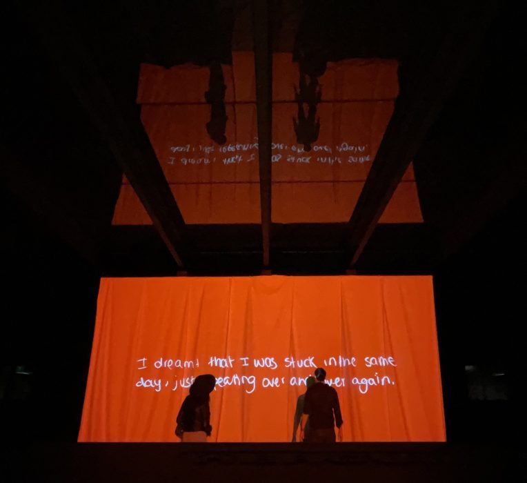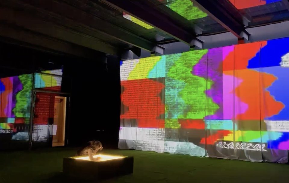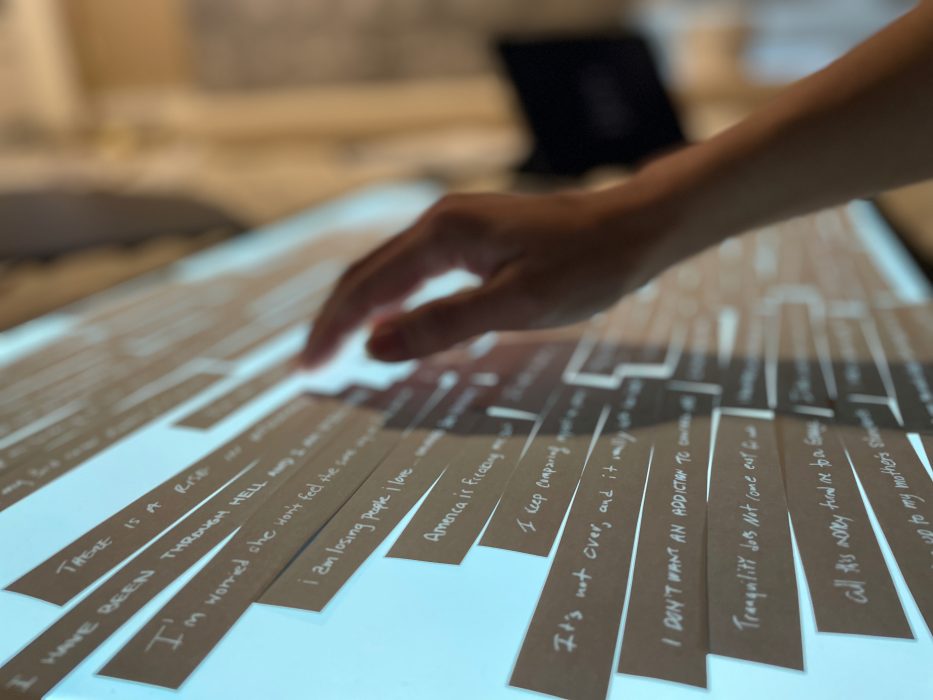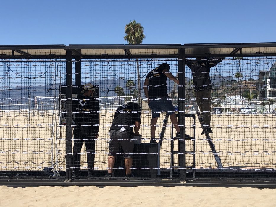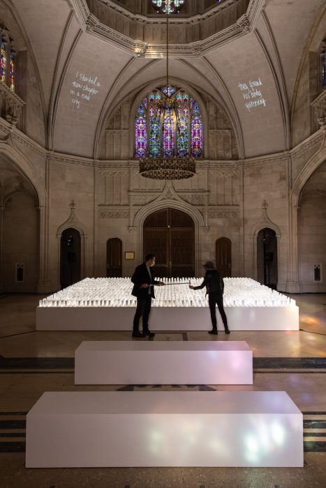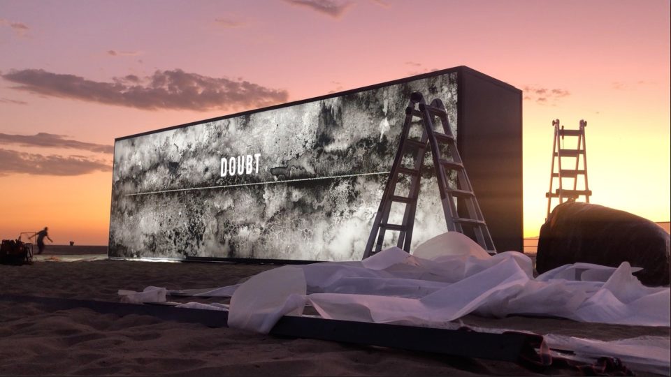 Behind the scenes of Light the Barricades in Los Angeles in 2019. When it traveled to Charlotte, the Doubt lightbox happened to stand in the backdrop of a wedding ceremony. They covered the word.