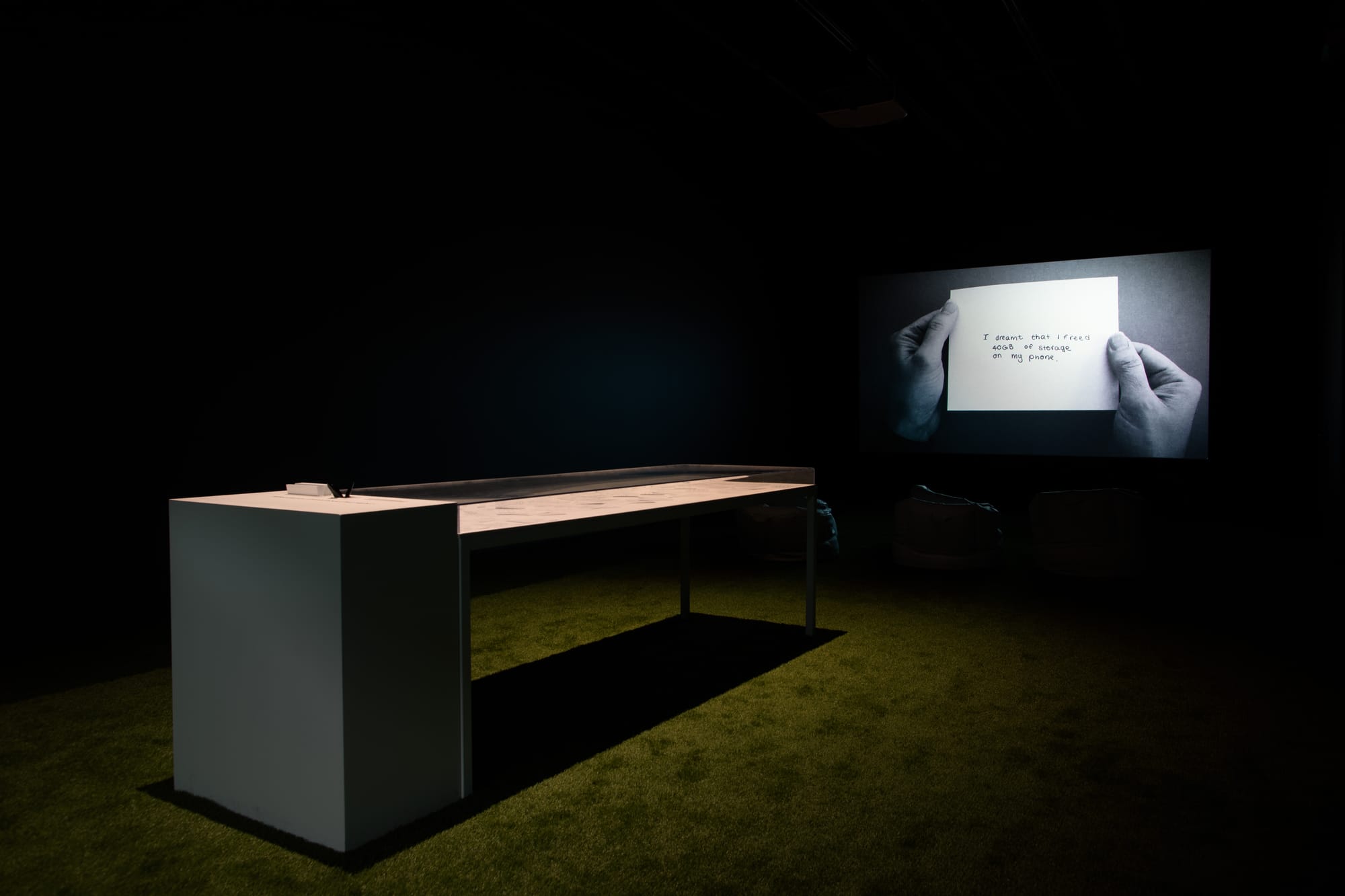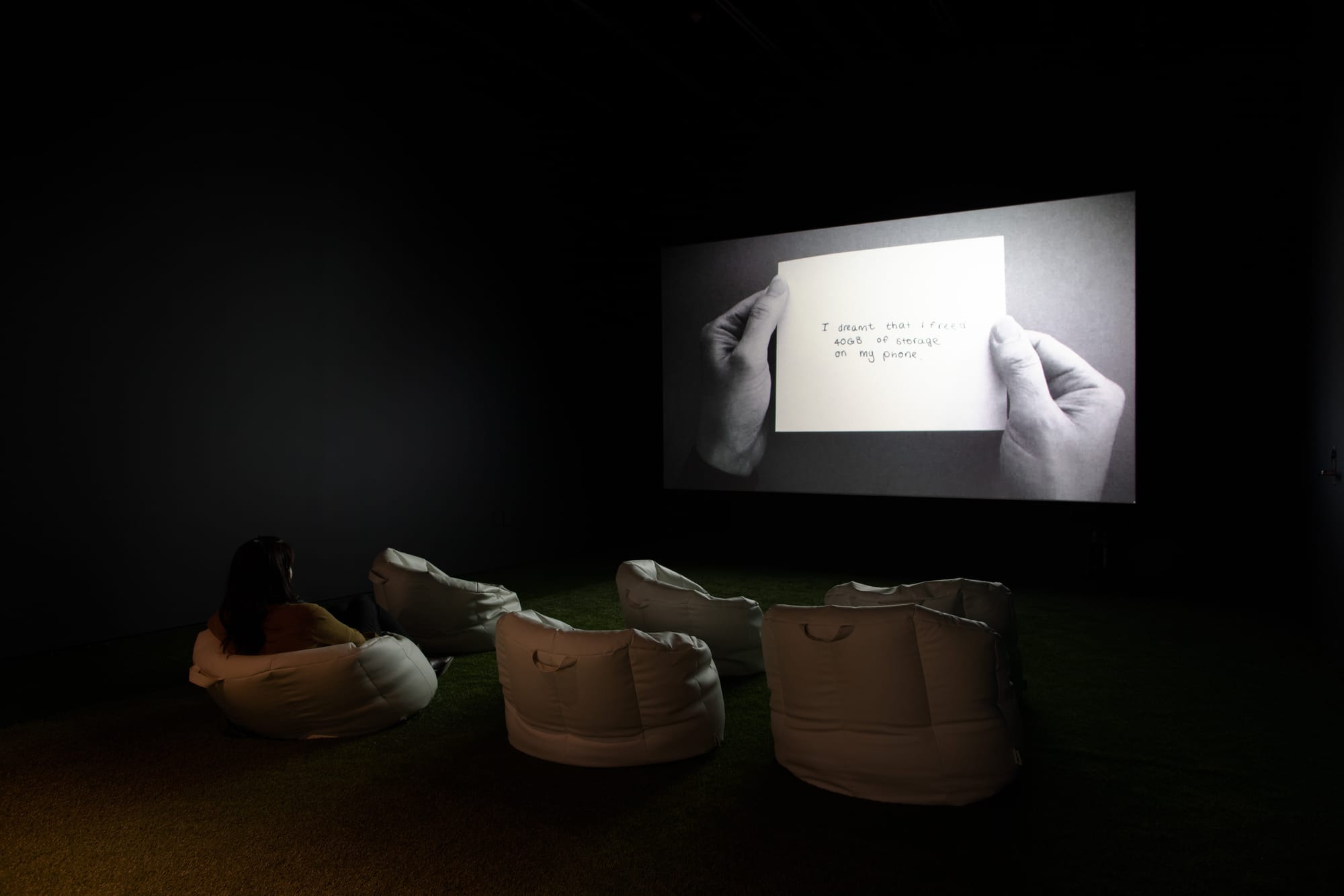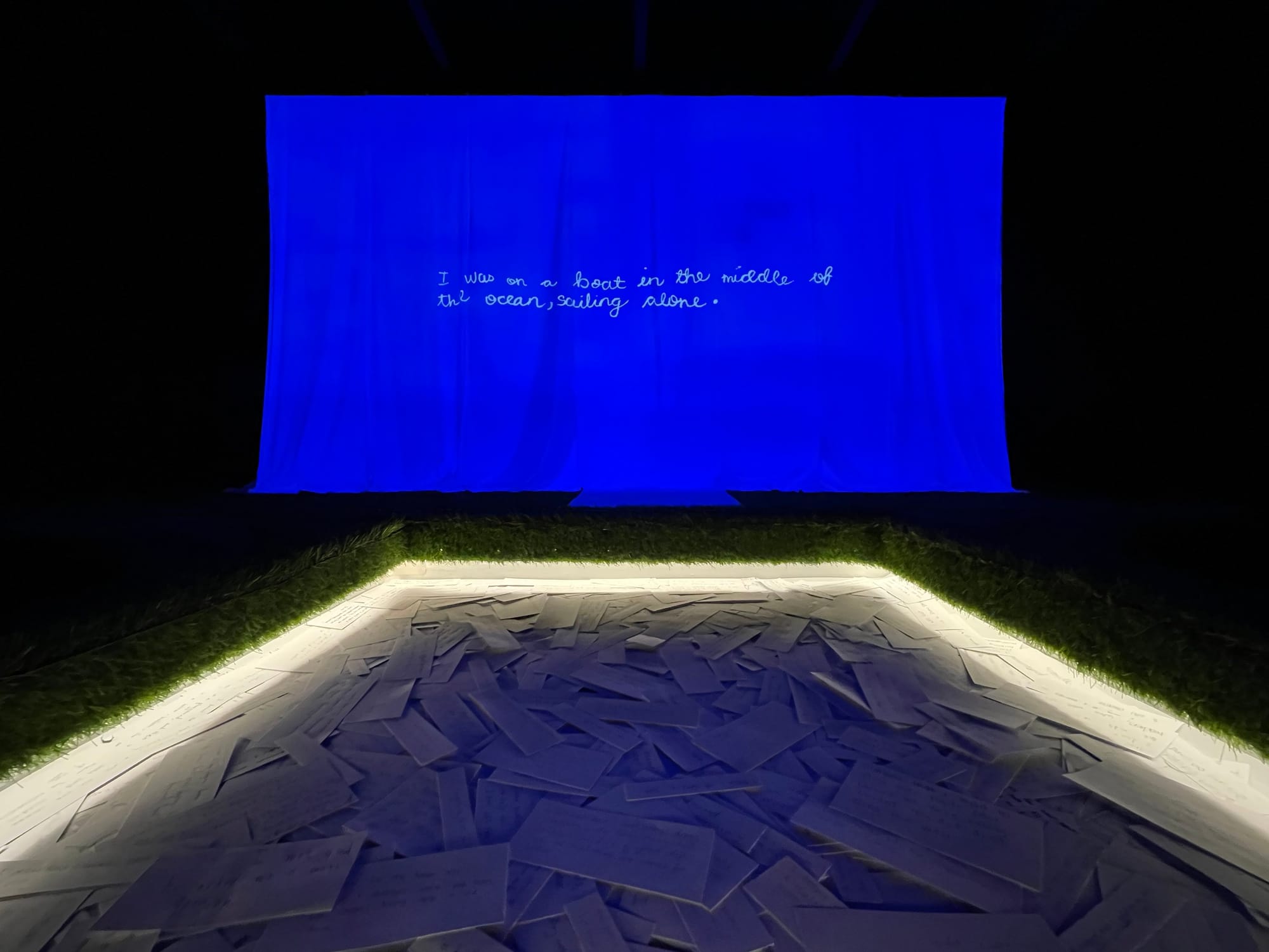 2022, The American School In London, London, England. 1300 sq ft gallery, 10’ h x 15’ w video projection. Projector, speakers, fabric, wood, glass, paper, pens. Installation assistance by Graham ‘Titch’ Fort, Joe Harris, Shane Murdock, Dean Hoffland, Mick Fernandez, and Youcef Benhadi. Organizational assistance by Jen Kirstein, Dean Evans, Gavin Hughes, and Cosmo Murphy. | 2023, Eli and Edythe Broad Art Museum, East Lansing, Michigan. Projector, speakers, wood, seating, paper, pens. Curated by Dalina Perdomo Alvarez. Organized by the Eli and Edythe Broad Art Museum in collaboration with Anjam Chaudhary and Michigan State University’s International Studies and Programs.