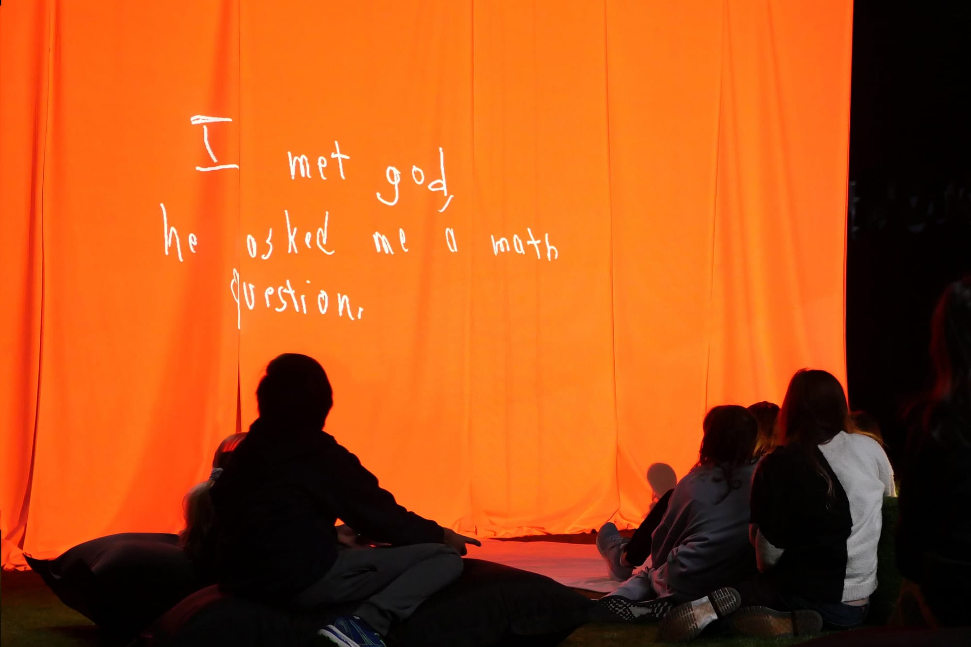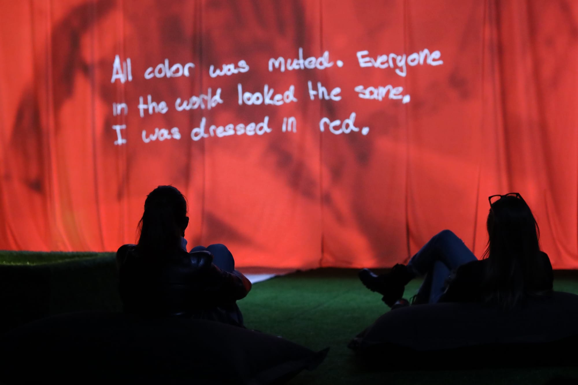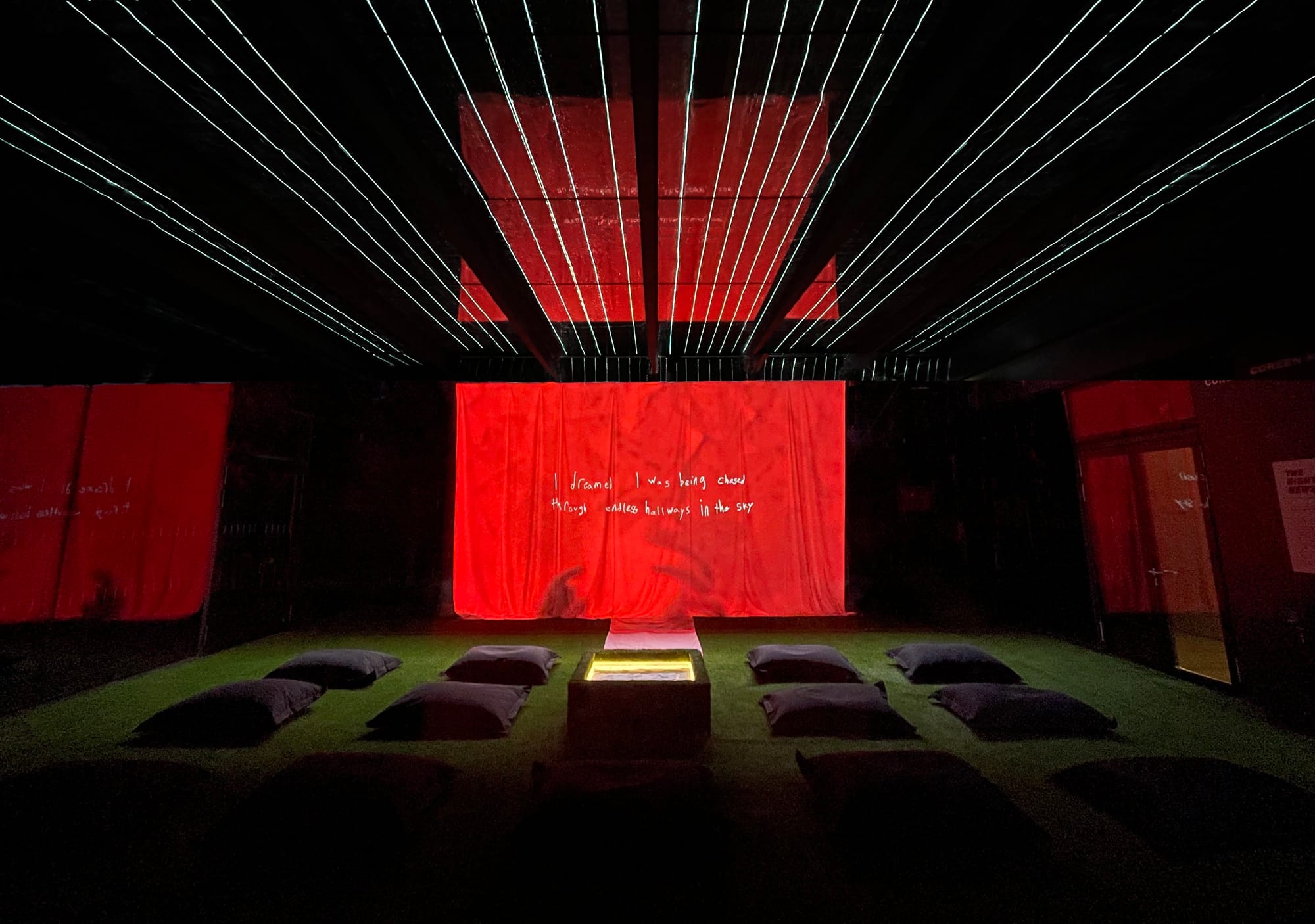 2022, The American School In London, London, England. 1300 sq ft gallery, 10’ h x 15’ w video projection. Projector, speakers, fabric, wood, glass, paper, pens. Installation assistance by Graham ‘Titch’ Fort, Joe Harris, Shane Murdock, Dean Hoffland, Mick Fernandez, and Youcef Benhadi. Organizational assistance by Jen Kirstein, Dean Evans, Gavin Hughes, and Cosmo Murphy. | 2023, Eli and Edythe Broad Art Museum, East Lansing, Michigan. Projector, speakers, wood, seating, paper, pens. Curated by Dalina Perdomo Alvarez. Organized by the Eli and Edythe Broad Art Museum in collaboration with Anjam Chaudhary and Michigan State University’s International Studies and Programs.
