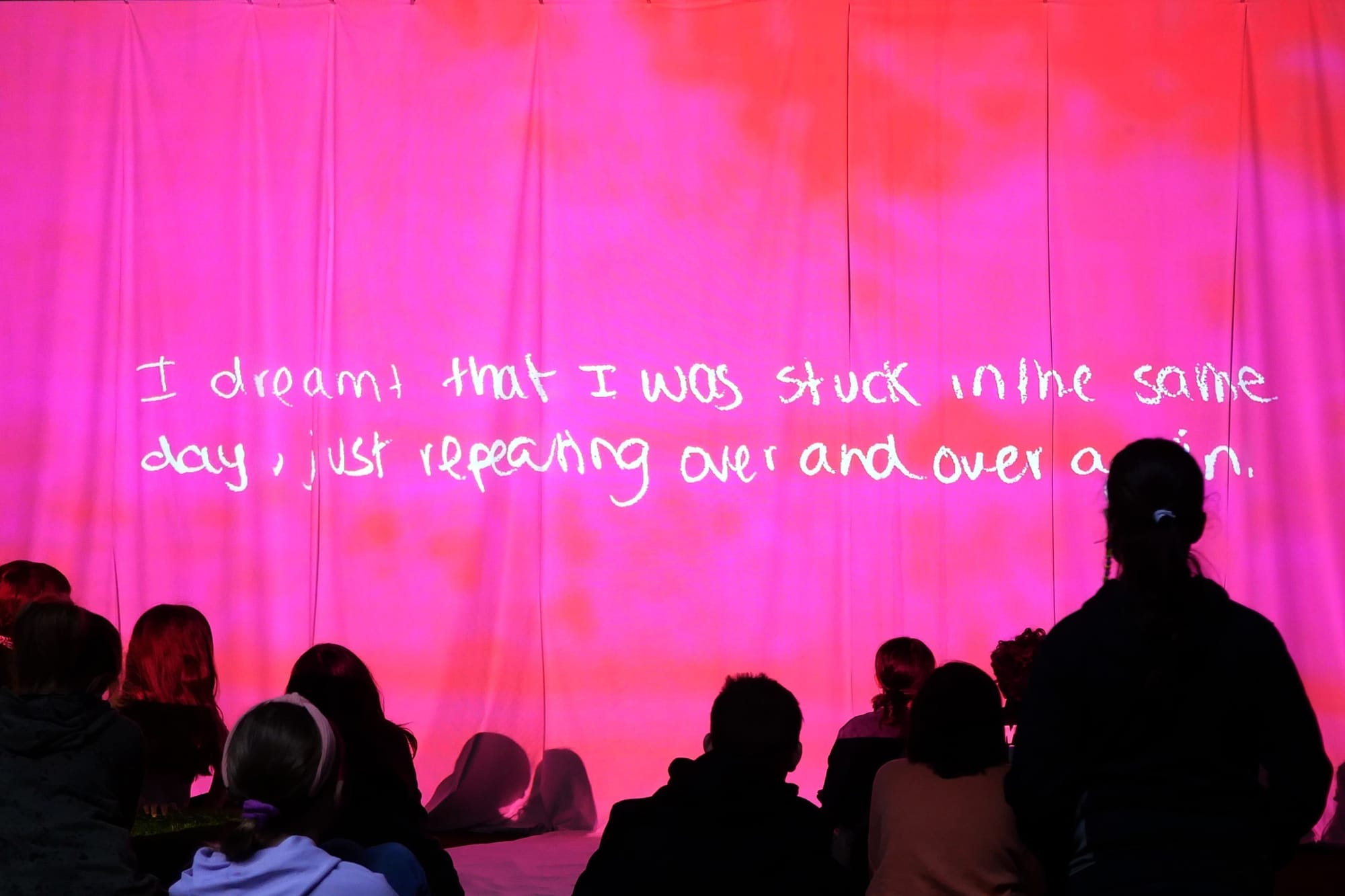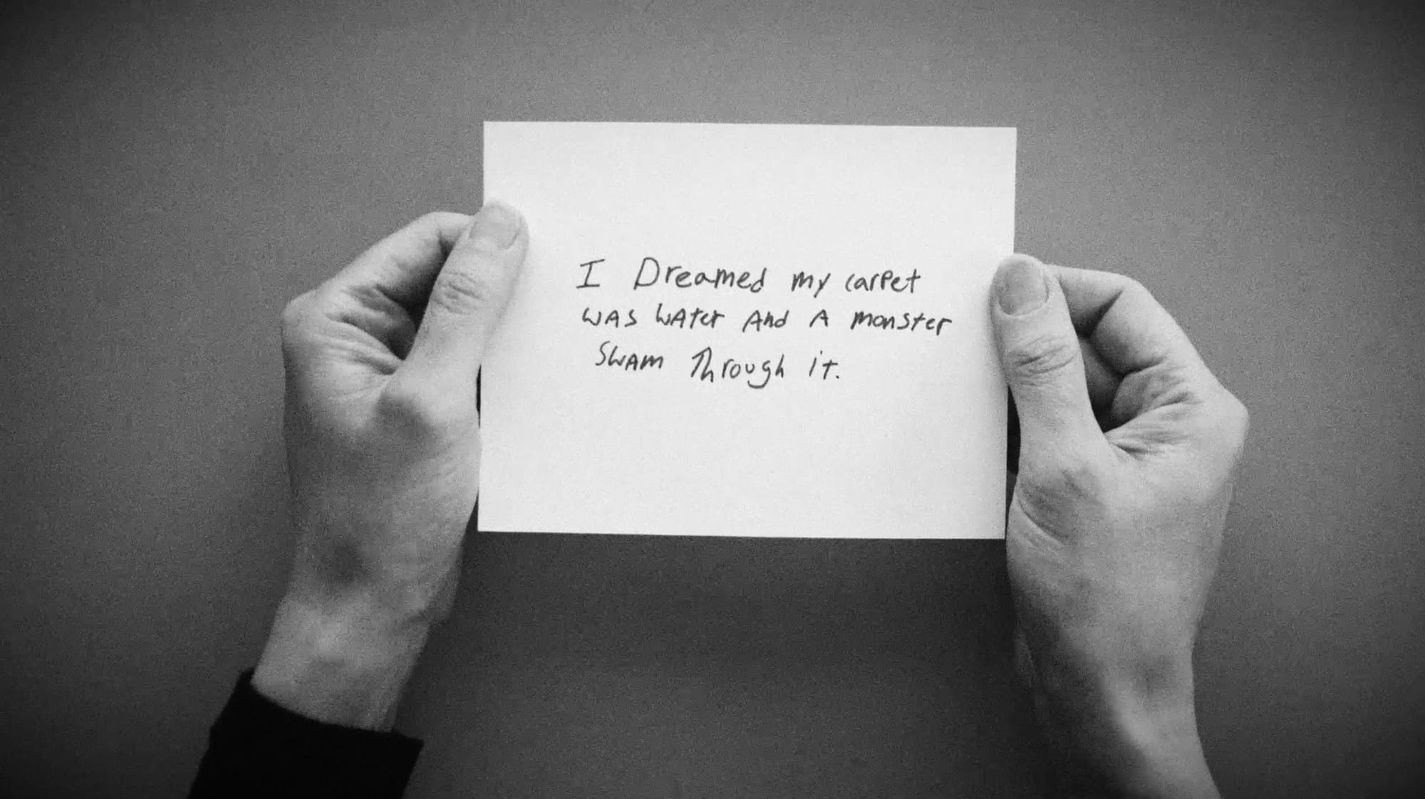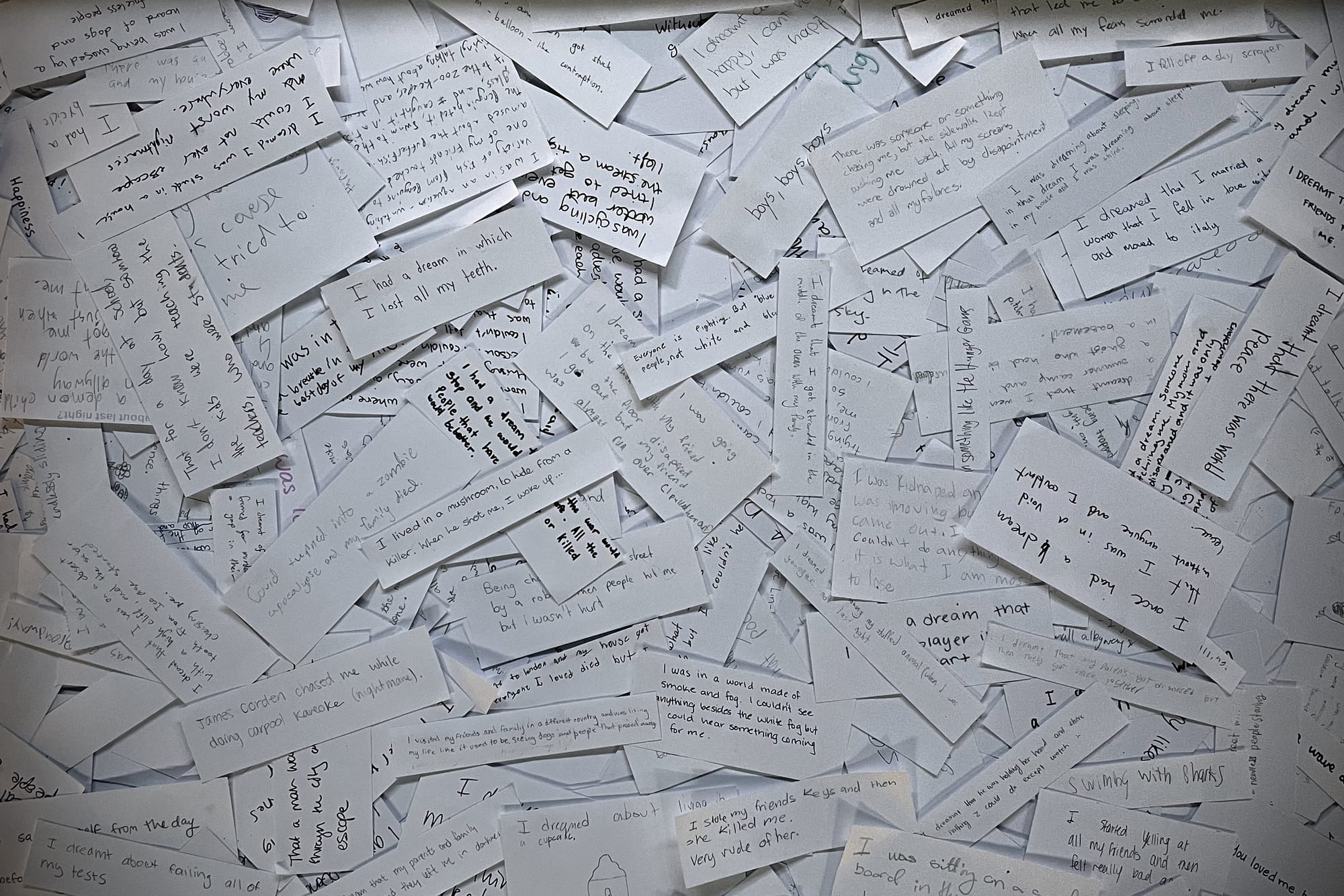 The Nightly News is a participatory video installation featuring thousands of visitors’ handwritten descriptions of their nightly dreams. Initially created at the American School in London and expanded at the Eli and Edythe Broad Art Museum, the installation invited visitors to submit their nightly dreams at a podium, view the collected reflections in a glass case, and sit and watch an ever-growing video of select responses. In the video, torn responses are presented in reverse, speaking to the sensation of recalling a dream by piecing together surreal scenes beyond the realm of logic.