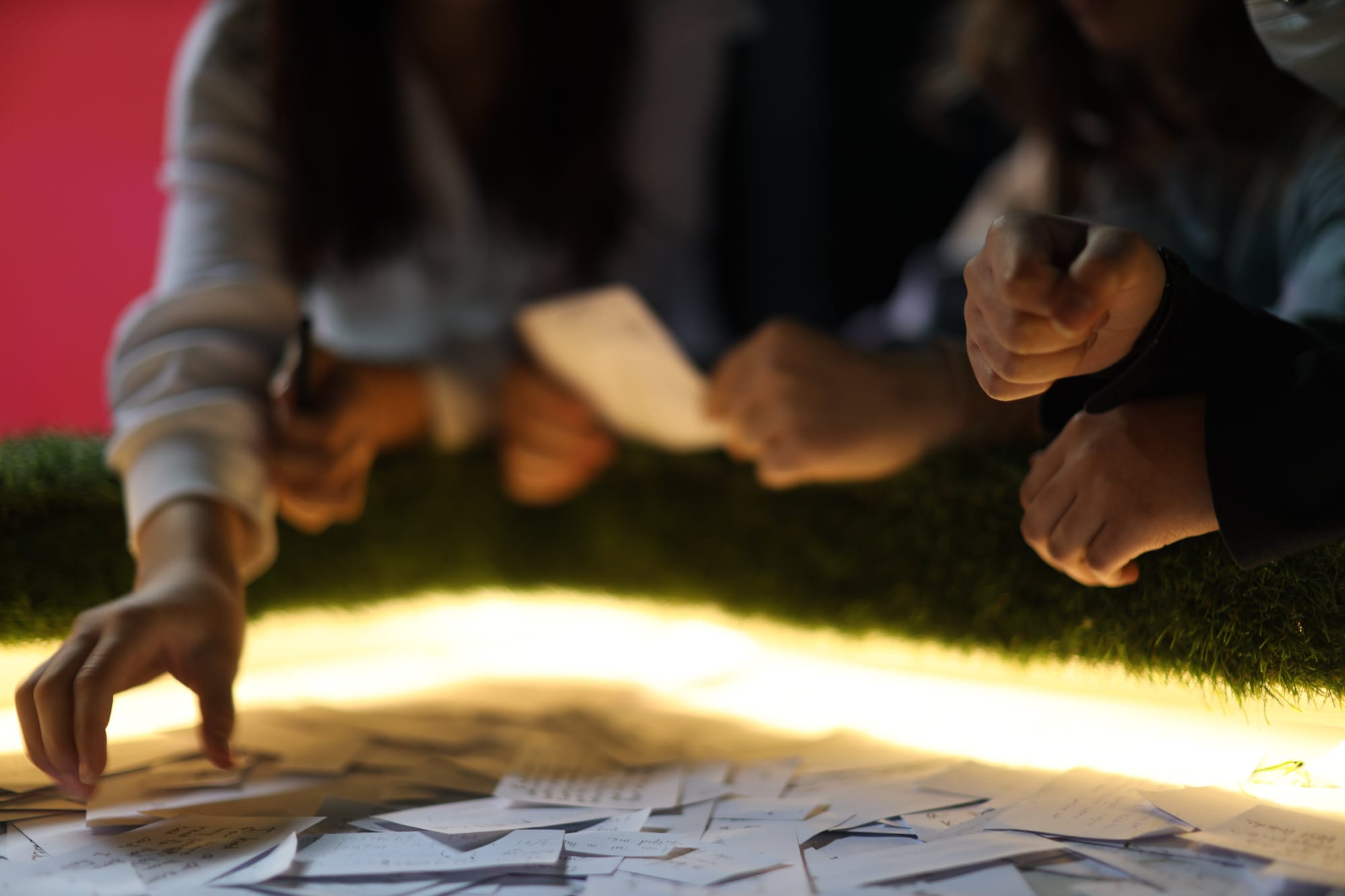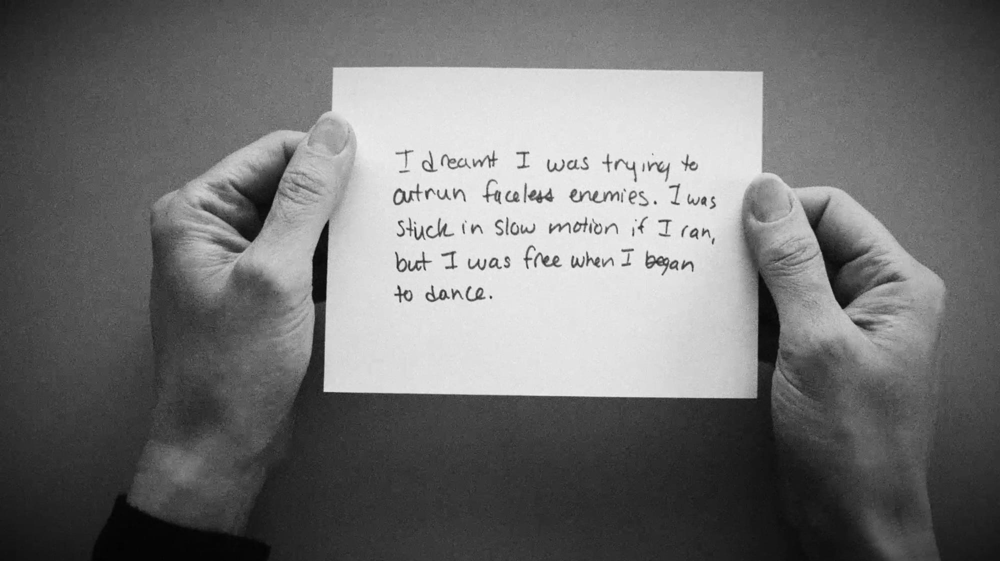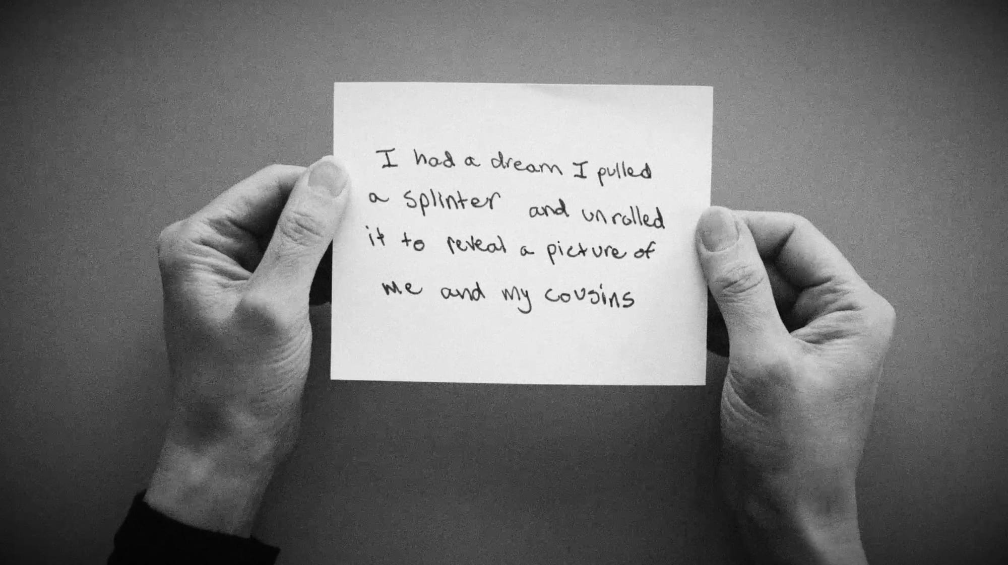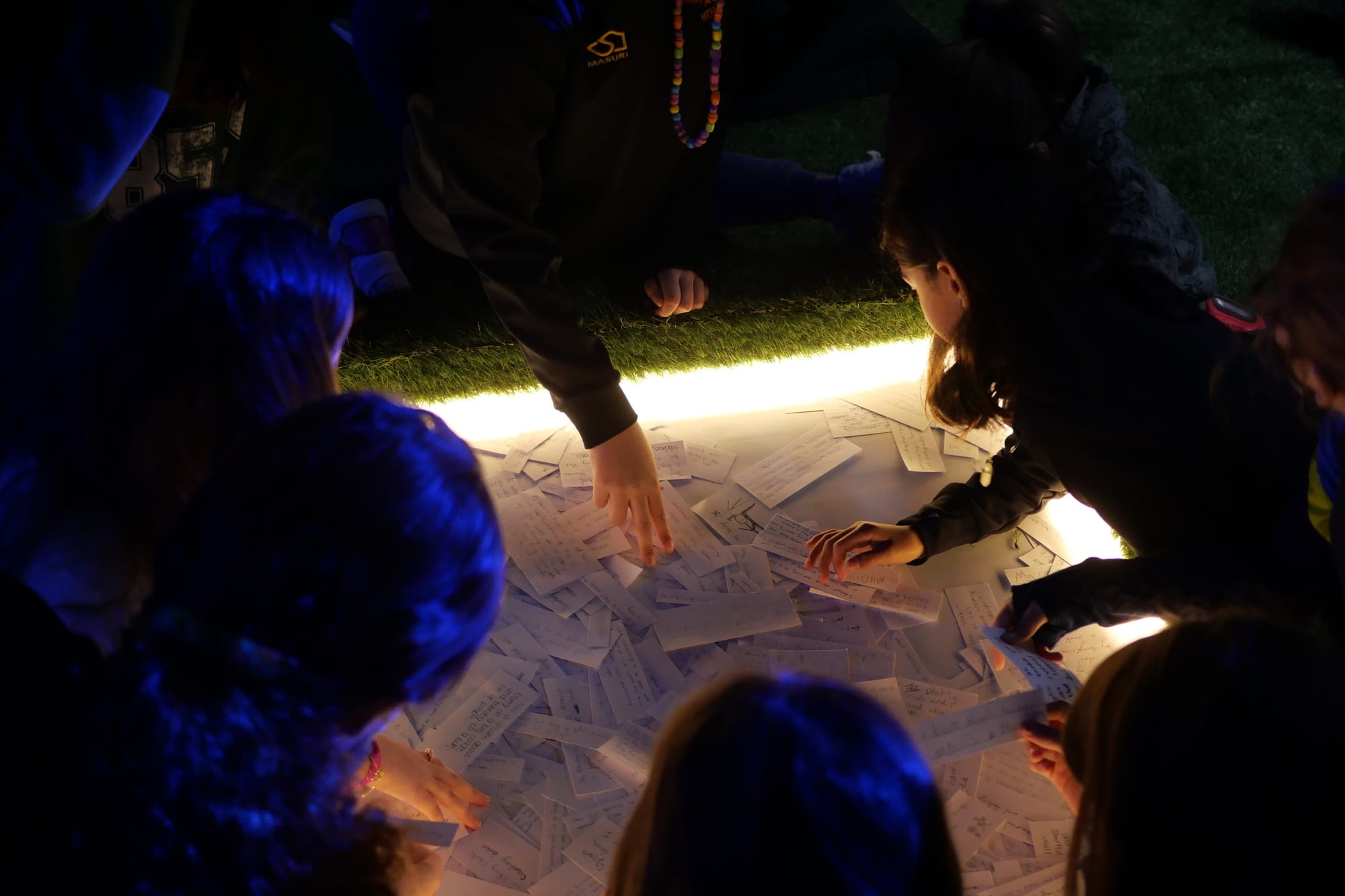 The Nightly News is a participatory video installation featuring thousands of visitors’ handwritten descriptions of their nightly dreams. Initially created at the American School in London and expanded at the Eli and Edythe Broad Art Museum, the installation invited visitors to submit their nightly dreams at a podium, view the collected reflections in a glass case, and sit and watch an ever-growing video of select responses. In the video, torn responses are presented in reverse, speaking to the sensation of recalling a dream by piecing together surreal scenes beyond the realm of logic.