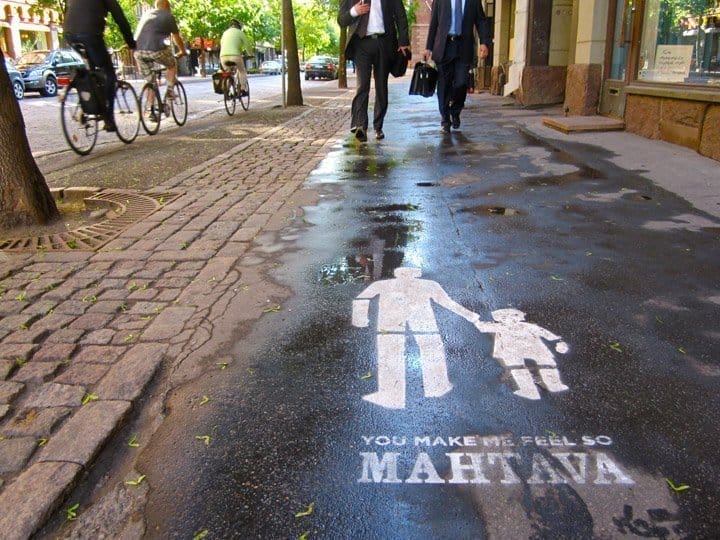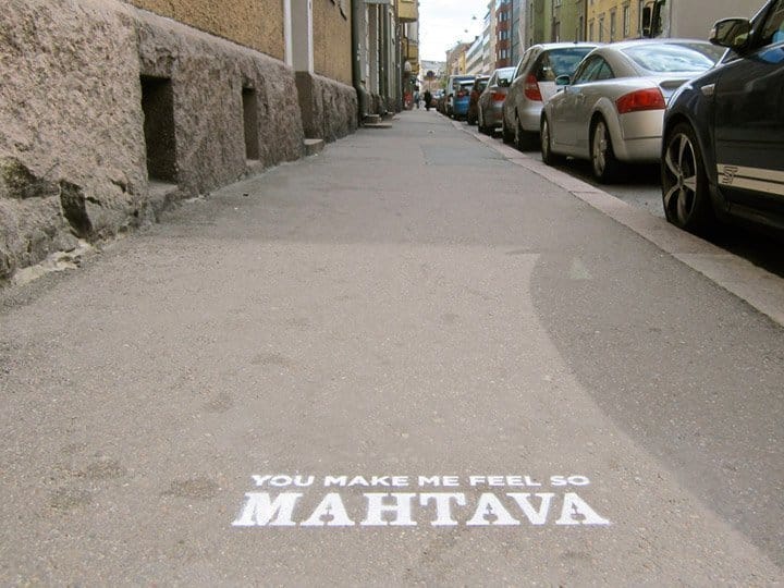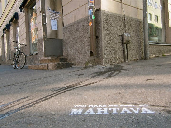 You Make Me Feel So Mahtava A final note to friends, marked near our favorite haunts in Helsinki upon moving away.2010, temporary spray chalk, Helsinki, Finland.
